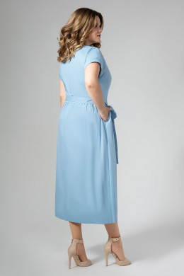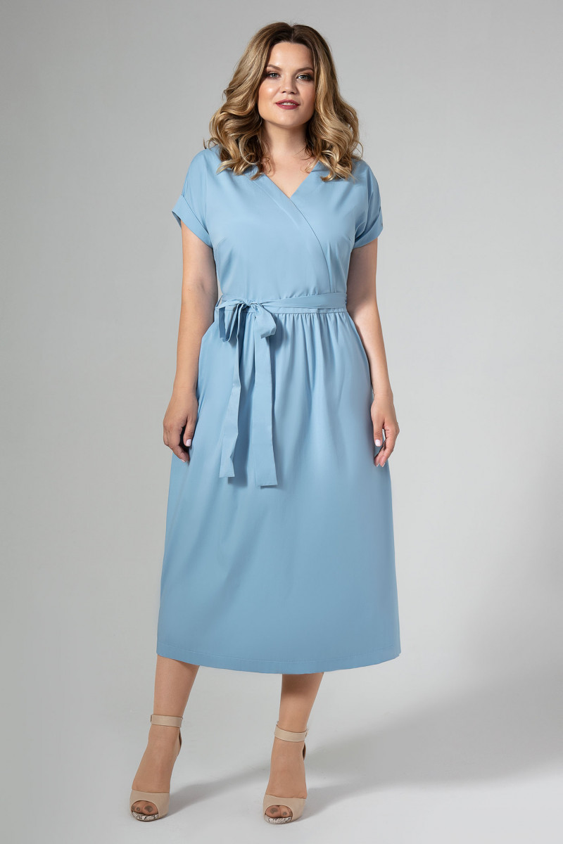 Летнее платье из хлопковой ткани. Платье отрезное по талии, с V-образным вырезом по горловине, со съёмным поясом из основной ткани, который подчеркивает талию. Платье удлиненное, с цельнокроенными рукавами, низ рукавов с притачными отложными манжетами. Застежка на потайную молнию по спинки. По бокам карманы.