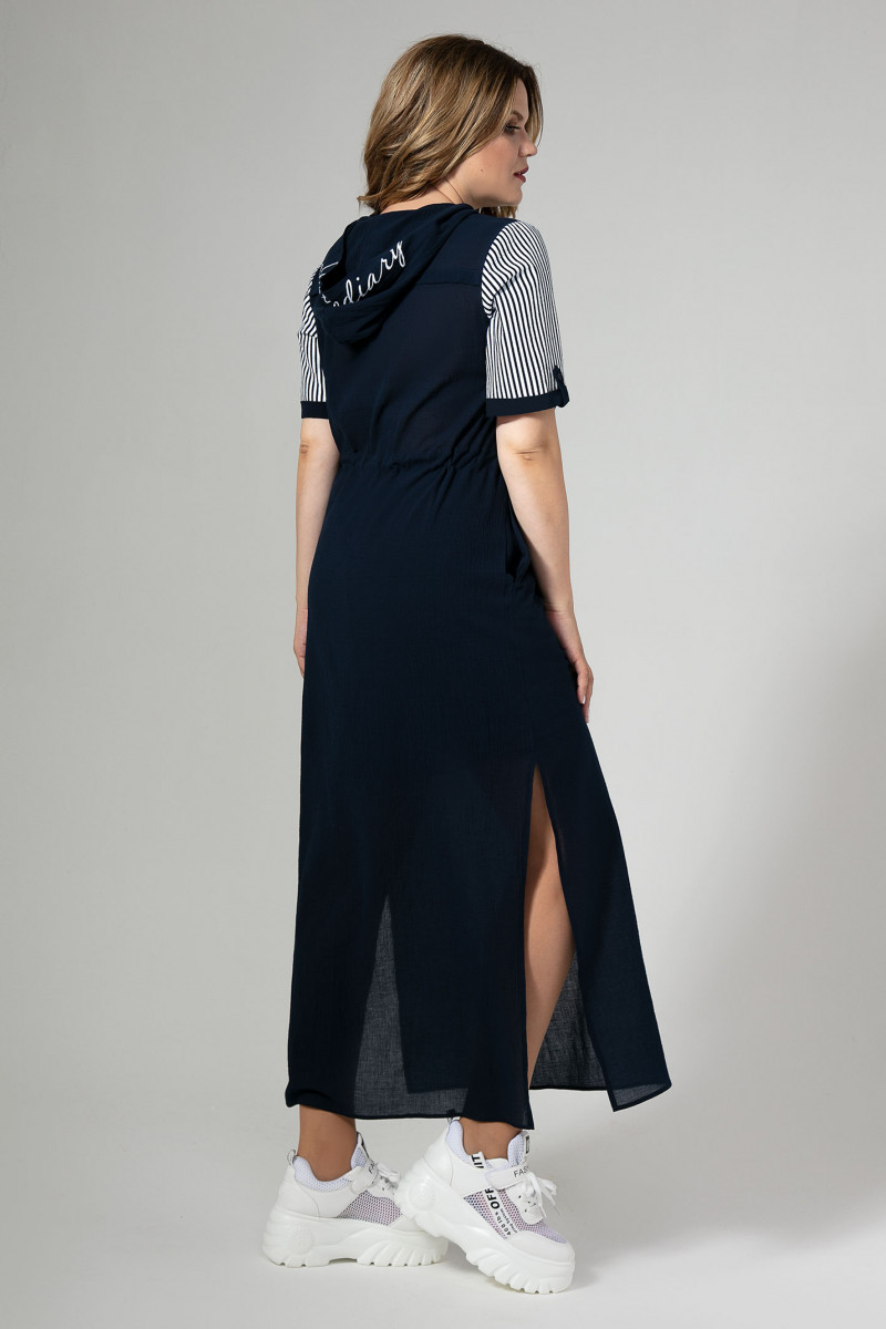 Молодёжное длинное платье из лёгкой хлопковой ткани. Платье прямого силуэта, с капюшоном. Рукава втачные короткие, низ рукавов с отложными манжетами и декоративными патами. Застежкна на планку по переду с петлями и пуговицами. На левой части переда карман с яркой декоративной печатью, также декоративная печать нанесена и на капюшон. По бокам удобные карманы и разрезы. По талии имеется кулиса, которая позволяет подчеркнуть талию, если кому необходимо. Нижняя часть платья на хлопковой подкладки. Легкое воздушное платье отличный вариант для жаркого летнего отдыха.
