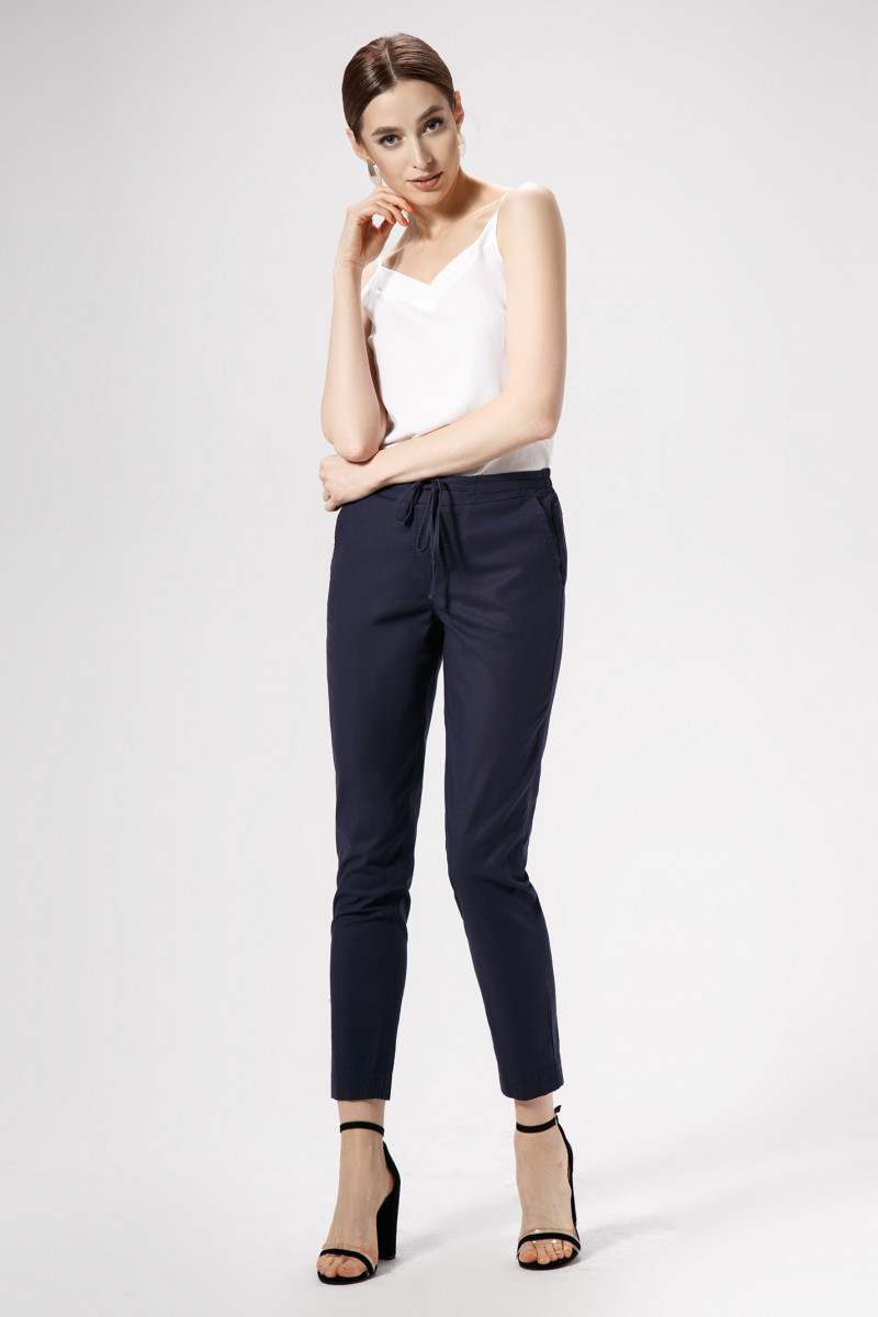 Стильные молодежные брюки из натуральной ткани с поясом на резинке с декоративным шнурком. Брюки чуть заужены к низу. По переду брюк карманы. На задней части брюк фигурная кокетка и декоративные карманы в рамку с петлей и пуговицей. Отличный вариант для активного летнего отдыха.