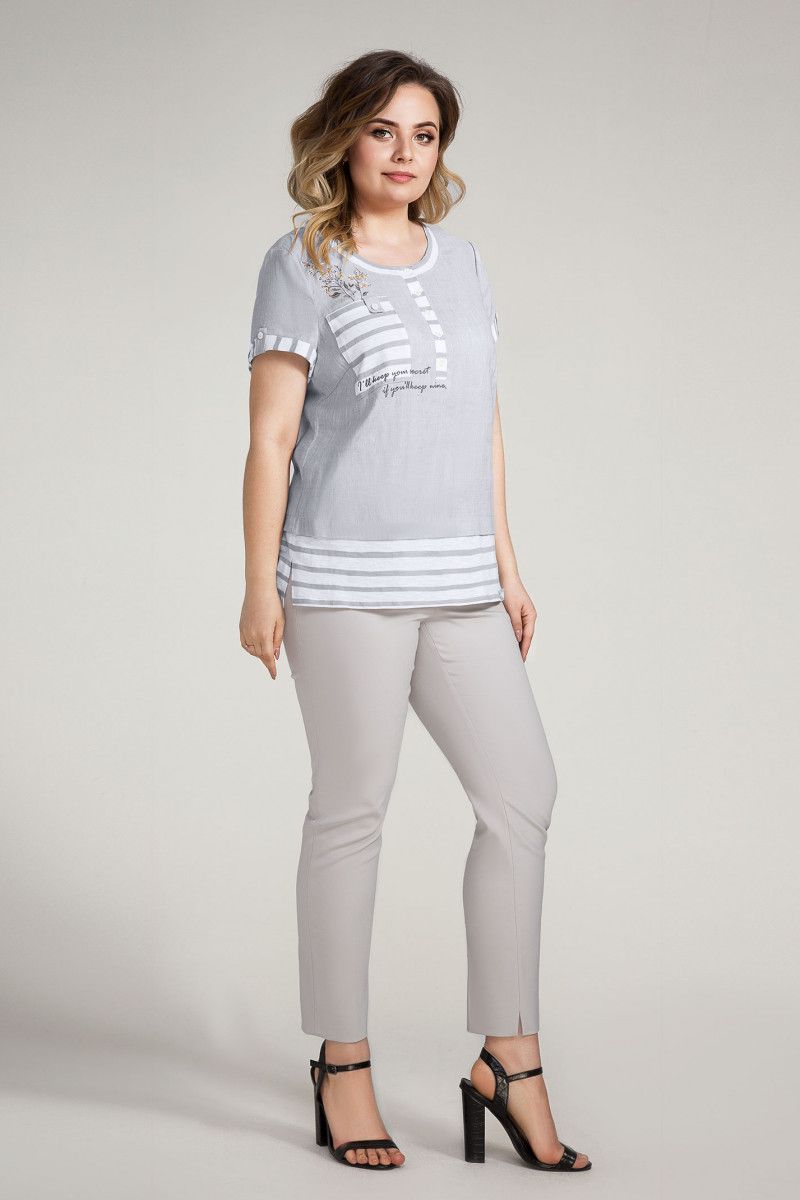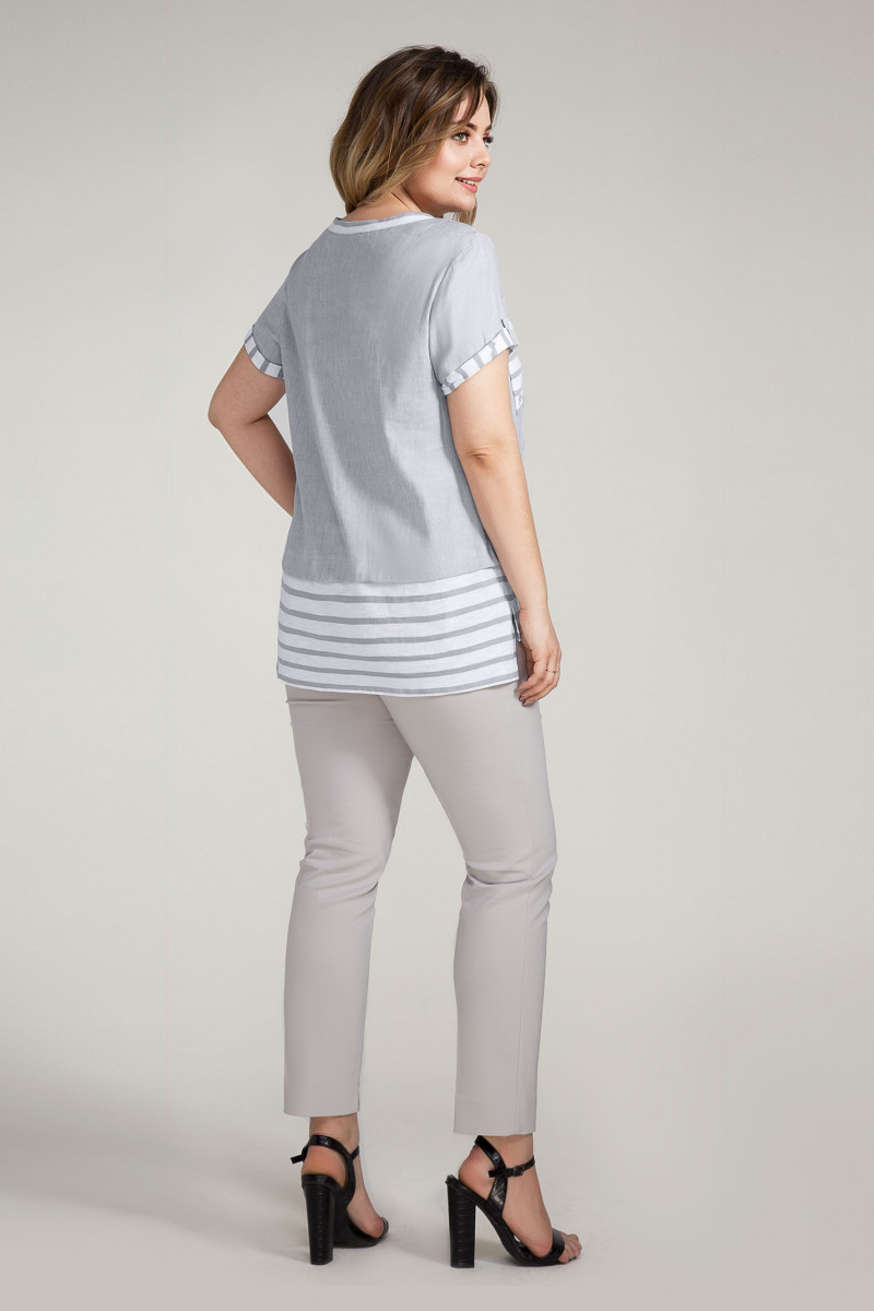 Стильная туника в сочетании льна и трикотажного хлопка в полоску. Вырез горловины круглый с планкой на петли пуговицы, с нагрудными вытачками, акцент сделан на декор-вышивку с накладным карманом. по линии низа притачная баска, боковые швы с разрезами, закругленной формы. Спинка прямая с притачной баской. Рукава короткие. Хороший вариант, для прогулок и отдыха.