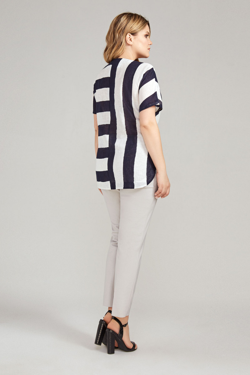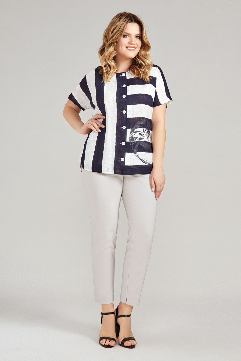 Стильная летняя блузка выполнена из натурального льняного тонкого полотна с графичным принтом в виде широкой полосы. Идеальный вариант на каждый день и для отдыха. Изделие благодаря прямому силуэту скрывает недостатки фигуры и подчёркивает достоинства.Сочетание тёмно-синего и белого цветов невероятно освежают лицо и дарят настроение,располагающее к отдыху и морской романтике. Принт в виде морской раковины чудесно дополняет образ. Игра полос в изделии визуально стройнит. Скруглённые разрезы по бокам внизу декорированы французским кружевом.Вырез горловины круглый.Застёзка спереди на петли и пуговицы .
