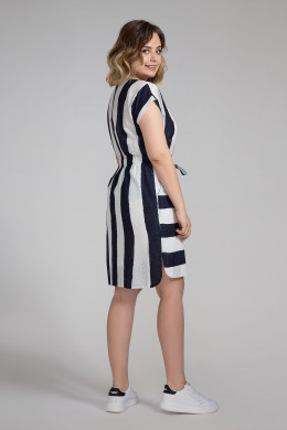 Эффектное летнее платье-рубашка из тонкого льняного полотна с графическим принтом в виде широкой полосы непременно придётся по вкусу молодой энергичной девушке,которая стремится выглядеть свежо и привлекательно,выделяться из толпы и при этом чувствовать себя комфортно.Крой платья и игра полос привносят динамику в образ и визуально стройнят фигуру,скрывая недостатки и подчёркивая достоинства.Цельнокроеный рукав,круглый вырез горловины,скруглённые линии низа изделия,разрезы по бокам,разные уровни длины по переду и спинке,внутренний пояс,протянутый на уровне талии,который завязывается спереди на бант,всё это делает платье оригинальным,удобным и радующим свою обладательницу. Идеальный вариант на каждый день в жаркую погоду.