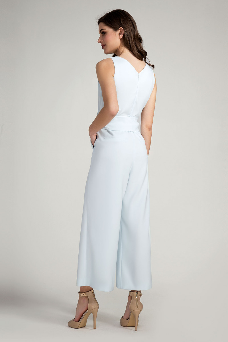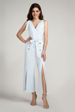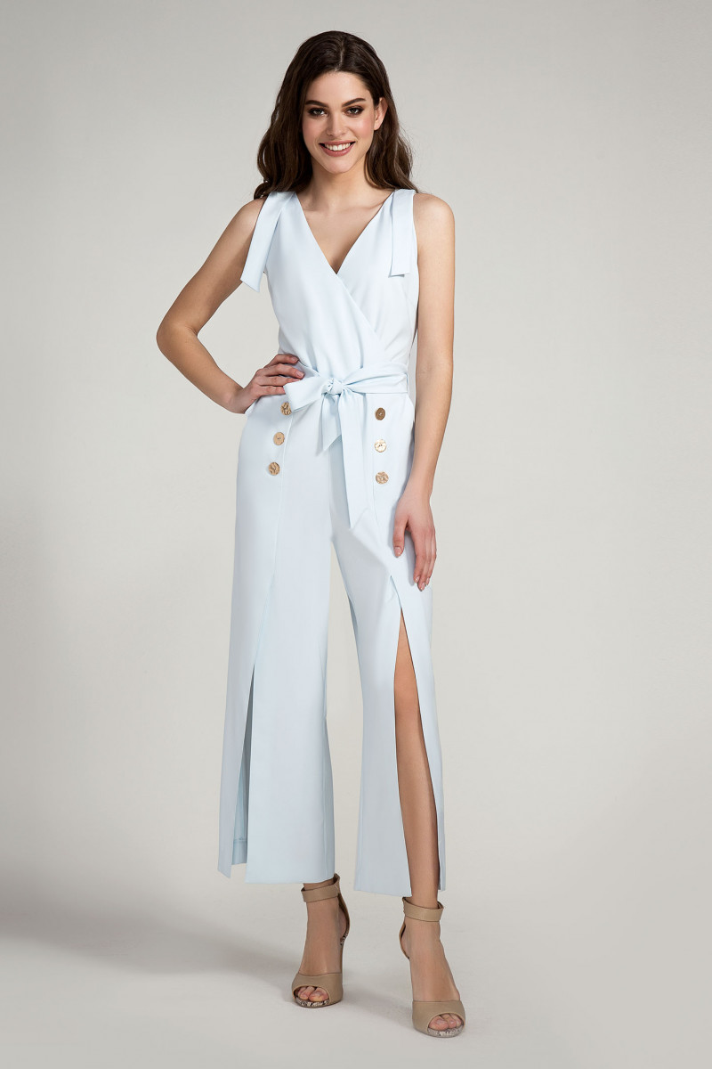 Шикарный и стильный нарядный комбинезон для современной ,модной и энергичной девушки,которая любит быть в центре внимания. Глубокий V-образный вырез горловины с запахом спереди и неглубокий с потайной молнией сзади. На плечах выполнена имитация застёжки на металлическую рамку и пату..По линии талии комбинезон отрезной.По линии реза спинка присборена на резинку.На талии выполнен пояс,завязывающийся спереди. Брюки очень модного на сегодняшний день свободного силуэта и актуальной длины ,до середины голени.Спререди по брюкам выполнены глубокие шлицы,декорированные металлическими стильными пуговицам.Шлицы роскошно рарпахиваются при ходьбе,создавая иллюзию лёгкости.В комбинезоне девушка будет прекрасно выглядеть на любой вечеринке,торжественном мероприятии и просто прогуливаясь по городу.