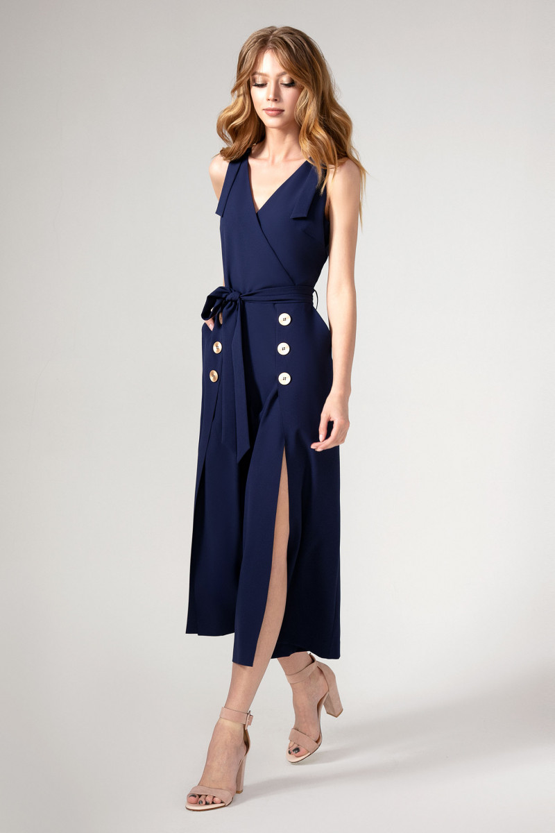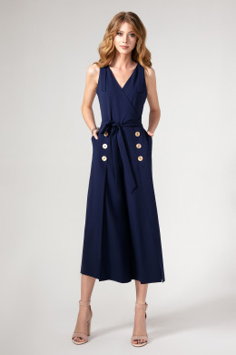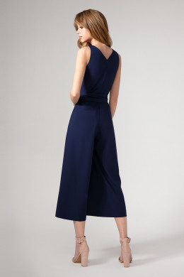Шикарный и стильный нарядный комбинезон для современной ,модной и энергичной девушки,которая любит быть в центре внимания. Глубокий V-образный вырез горловины с запахом спереди и неглубокий с потайной молнией сзади. На плечах выполнена имитация застёжки на металлическую рамку и пату..По линии талии комбинезон отрезной.По линии реза спинка присборена на резинку.На талии выполнен пояс,завязывающийся спереди. Брюки очень модного на сегодняшний день свободного силуэта и актуальной длины ,до середины голени.Спререди по брюкам выполнены глубокие шлицы,декорированные металлическими стильными пуговицам.Шлицы роскошно рарпахиваются при ходьбе,создавая иллюзию лёгкости.В комбинезоне девушка будет прекрасно выглядеть на любой вечеринке,торжественном мероприятии и просто прогуливаясь по городу.