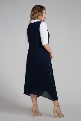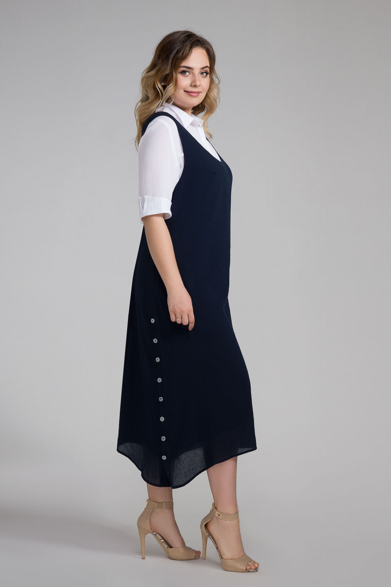 Сарафан расширенного силуэта, с глубоким вырезом горловины, с декоративными застежками на петли и пуговицы по бокам.