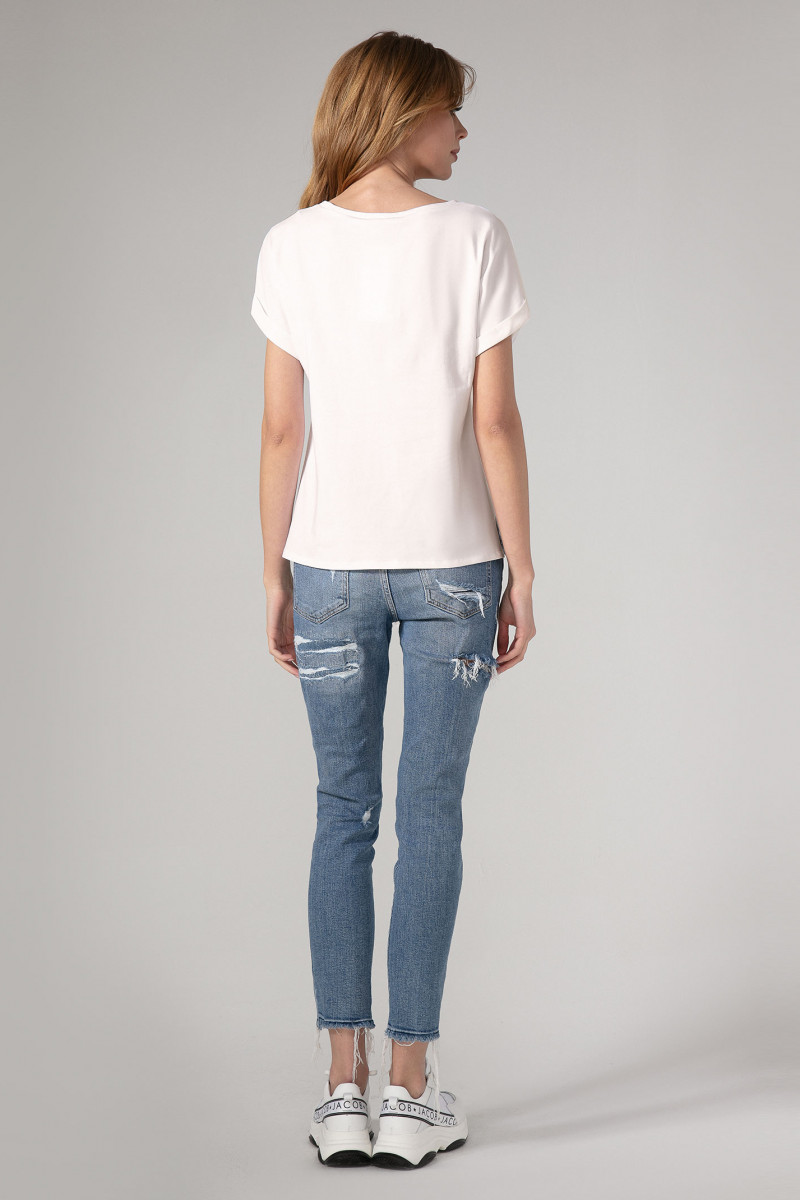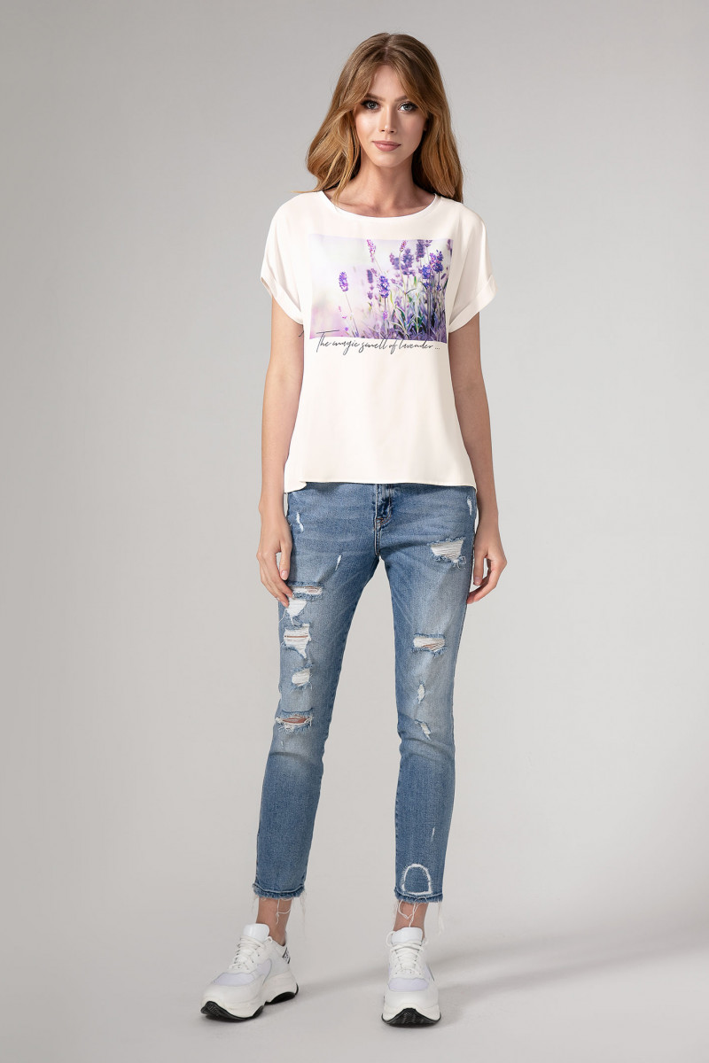 Стильная, романтичная блузка прямого силуэта , с круглым вырезом горловины, со спущенной линией плеча и отложными манжетами, деталь переда с оригинальной фотопечатью. Спинка из хлопка, лаконичная. Интересный вариант как по случаю, так и без него.