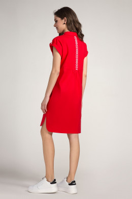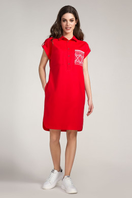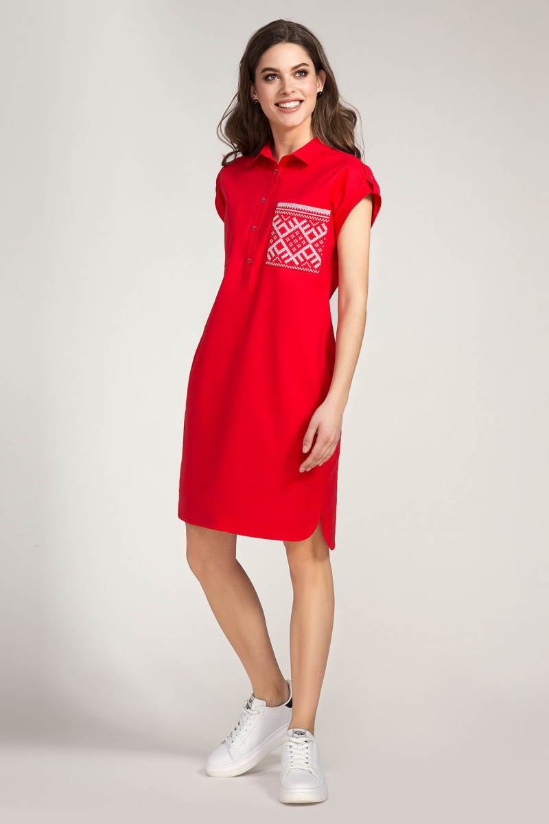 Молодежное платье из натуральной ткани с эффектной вышивкой в национальном стиле на кармане и на спинке. Платье свободного кроя, с воротником, с застежкой на кнопки по переду, длиной до коленей, спинка чуть удлиненная.В боковых швах и на груди карманы.
