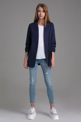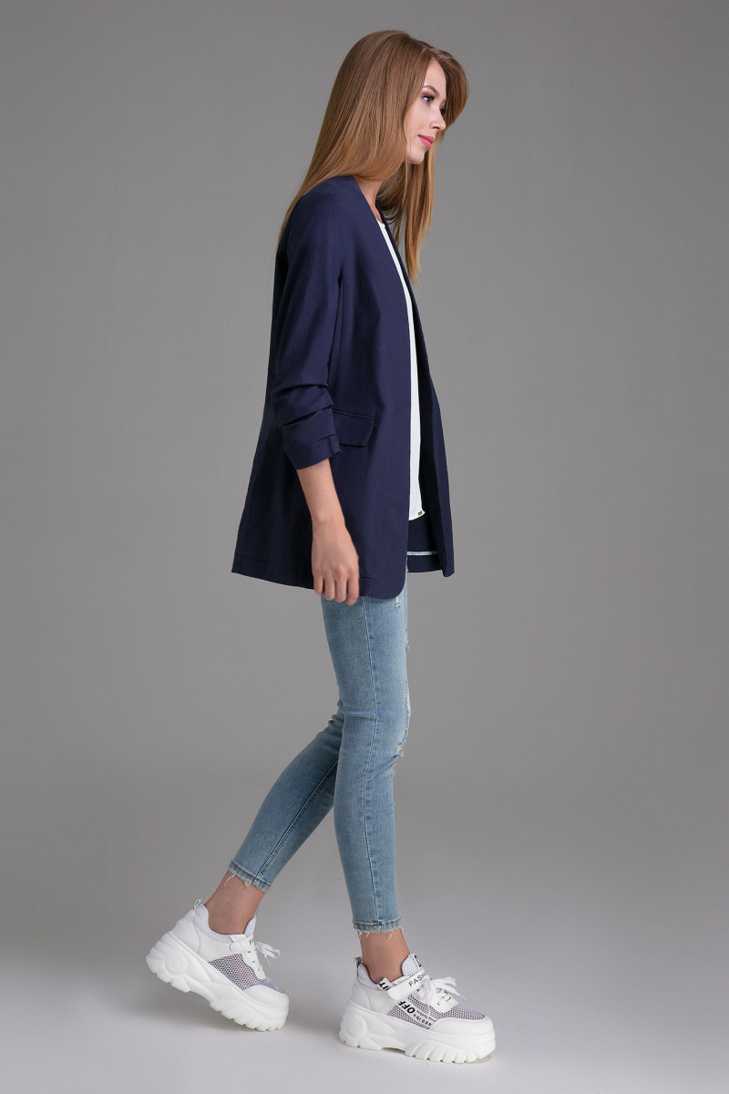 Стильный модный жакет из льняной ткани в стиле "кэжуал". Это повседневный удобный и практичный жакет, который отлично сочетается как с джинсами, так и с брюками. Жакет удлиненный, без застежки, рукава длиной ниже локтя. По переду имеются карманы. Спинка со средним швом, который заканчивается шлицей. Жакет без подкладки.