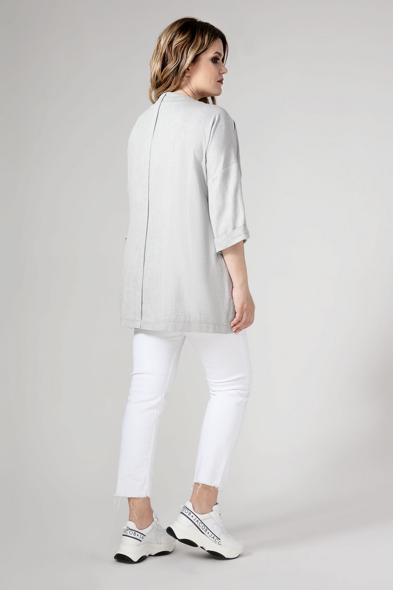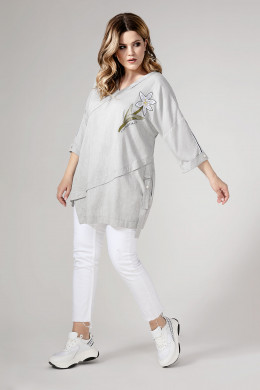 Лёгкая и тонкая туника из нежнейшего вискозного полотна.Невероятно стройнит фигуру,дарит чувство комфорта в жаркую летнюю погоду и освежает лицо за счёт цвета ткани и вышивки в виде цветка.Крой туники ассиметричный с диагональными резами по переду.Горловина тоже ассиметричная с одним отложным мацканом. Рукав длиной 3/4 с притачным отложным манжетом.По плечевым швам и рукавам выполнены лампасы из основной ткани.В левом боковом шве выполнен удобный внутренний карман,декорированный патами,кнопкой и полукольцом. Спереди туника имеет неровную линию низа фигурной формы. Прекрасный вариант для энергичной и подвижной девушки на каждый день.