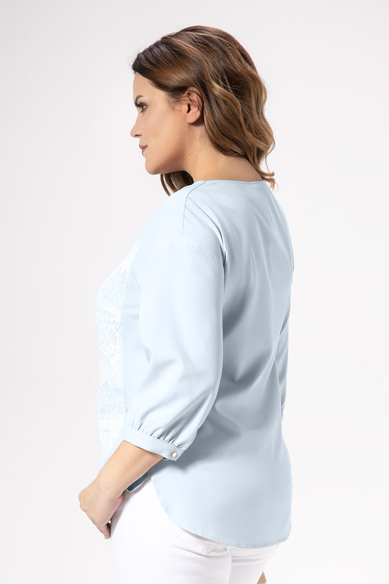 Нарядная летняя туника декорированая изысканным кружевом и функциональной застёжкой с навесными петлями и металлическими блестящими пуговичками спереди. Вырез горловины круглый с разрезом на застёжку спереди. Низ изделия разной длины спереди и сзади.По бокам разрезы.Края деталей переда и спинки снизу скруглены.Линия плеча преспущена.Рукав на тонком отрезном манжете с пуговицей чуть пресборен по низу. Прекрасный вариант на каждый день и для торжественного случая.