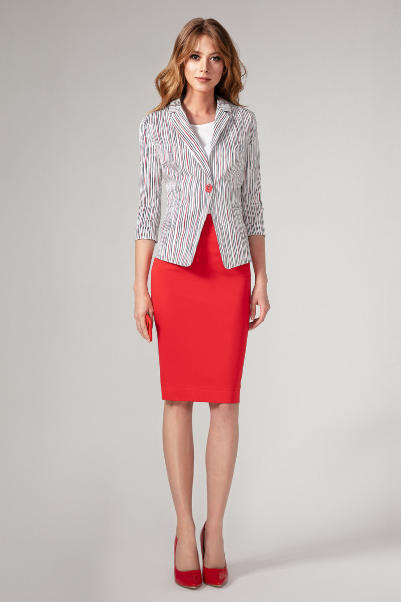 Элегантный летний костюм и тонкой хлопковой ткани с абстрактным рисунком в полоску на жакете. Костюм создан для уверенной в себе женщины, которая знает, как выглядеть неотразимо, и при этом чувствовать себя комфортно. Отличный вариант для офиса.