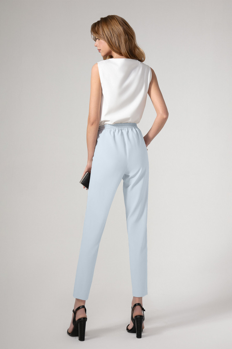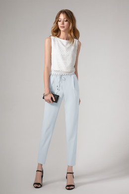 Практичные,стильные и нарядные женские брюки выполнены из мягкого эластичного текстиля. отрезной пояс на резинке на уровне талии даёт чувство комфорта.В пояс протянут шнурок,заязывающийся спереди.По переду от верхнего среза оформлены складки (по одной с каждой стороны). В боковых швах-внутренние карманы.Брюки мягко заужены книзу. Прекрасный вариант летних брюк на каждый день.