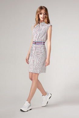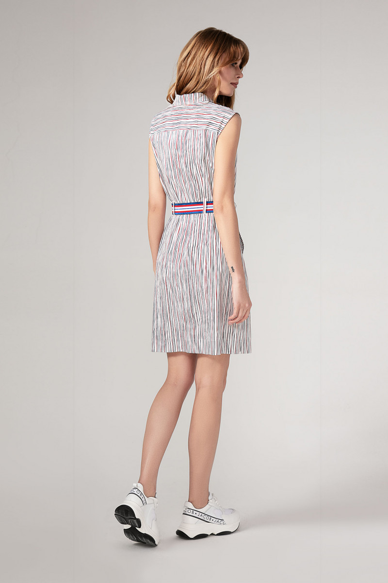 Платье из хлопковой ткани, рисунок в полоску. Платье свободного силуэта, длиной до коленей. Детали переда с центральной планкой на кнопки, с горизонтальной кокеткой и рельефными швами от кокетки до низа. На боковых частях переда расположены боковые накладные карманы с клапанами, а также двумя клапанами от кокетки. Спинка с кокеткой, средним швом и рельефами от кокетки до низа. В комплект входит съемный пояс на резинке, в полоску. Хороший вариант для отдыха и будней.
