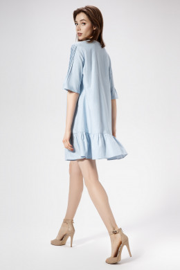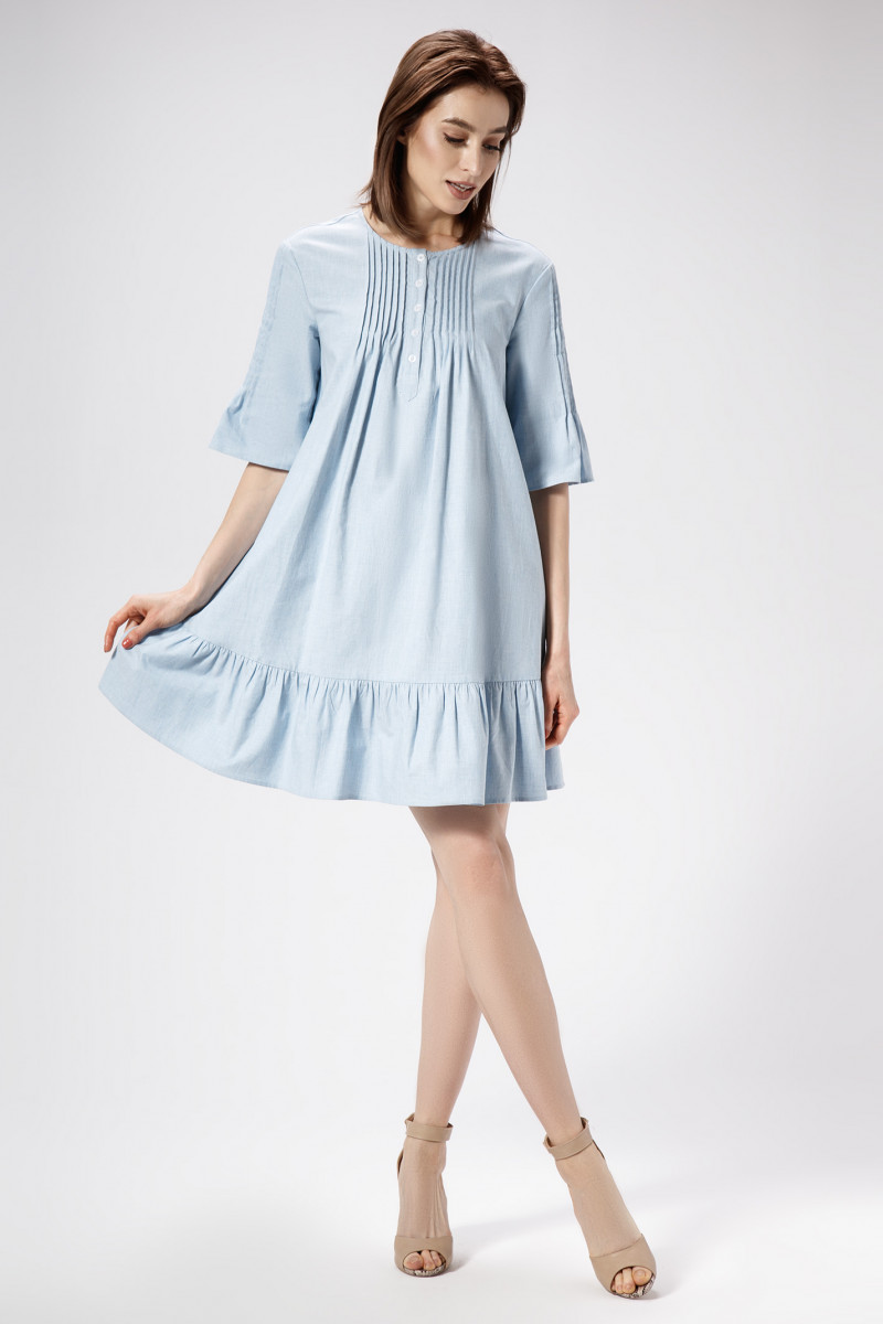 Стильное молодёжное платье из хлопкового полотна имеет очень актуальный трапецевидный силуэт и максимально комфортно при эксплуатации. Оно выгодно подчёркивает достоинства фигуры,скрывая при этом недостатки. Вырез горловины круглый .От горловины выполнена планка -застёжка с петлями и пуговицами. Вдоль планки оформлены отстроченные защипы. По низу платья выполнен притачной валан,придающий образу женственность. Рукава втачные.От оката также выполнены недлинные отстроченные защипы.Книзу рукав образует валан.Стильное и модное платье летящего силуэта наверняка порадует свою яркую обладательницу на отдыхе и как вариант на каждый день.
