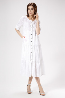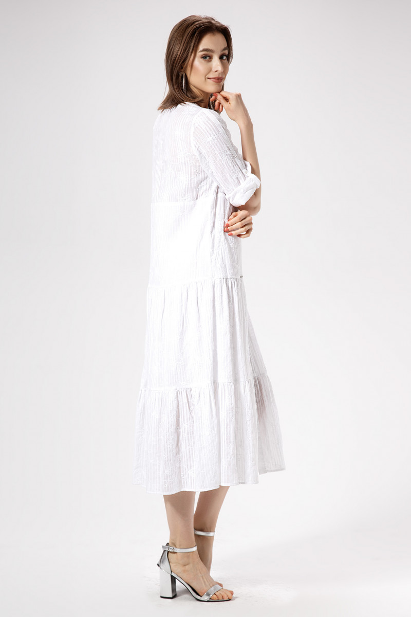 Нежнейший летний хлопковый длинный сарафан.Вырез горловиныкруглый с кулиской.Рукав длиной 3/4 с тесьмой для регулировки длины сбоку. Лиф отрезной и держит три яруса воланов. Накладные карманы для удобства спереди. Миниатюрные металлические пуговички являются милым акцентом и декором сарафана. Изделие предназначено для отдыха и прогулок жарким летом.