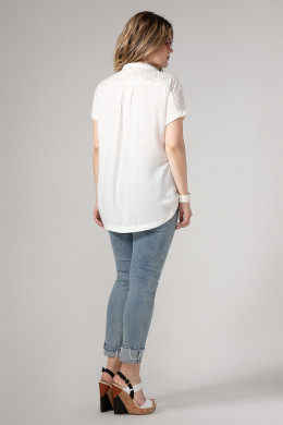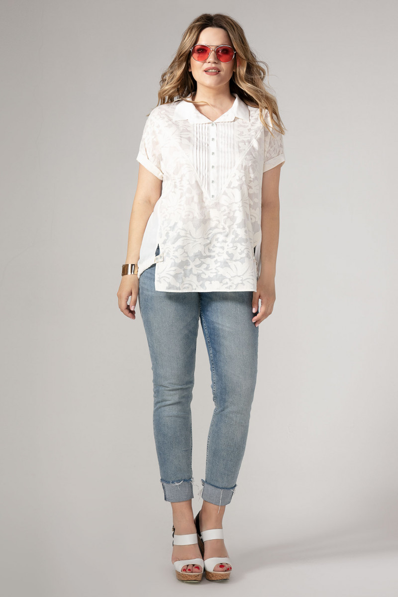 Стильная и невесомая летняя блузка прекрасно смотрится с джинсами и летними брюками. Она выполнена из двух видов натуральных тканей: с нежной вышивкой и без неё.Треугольной формы резы по переду,рубашечного типа застёжка с вертикальными защипами и воротник на стойке визуально стройнят и смотрятся очень эффектно.Рукав цельнокроёный,короткий,с отложным притачным манжетом по низу.Спинка удлинена относительно переда и имеет округлую фигурною линию низа.Боковые швы перенесены на переднюю часть.Части спинки, выходящие вперёд ,по низу стянуты на хлопковую тесьму,которая крепится на передней части при помощи пуговицы.По спинке выполнена отрезная кокетка со сборкой по центру.Прекрасный вариант летней блузки для работы и на каждый день в жаркую летнюю погоду.