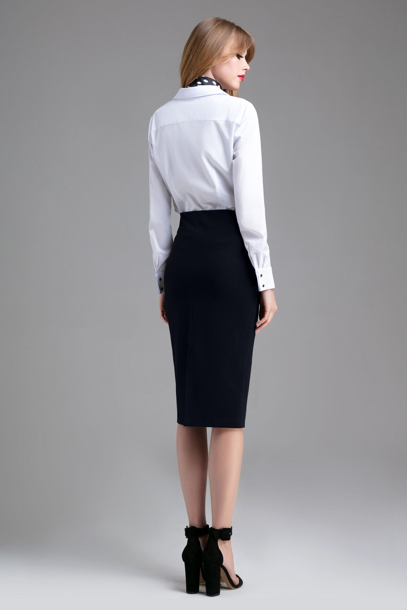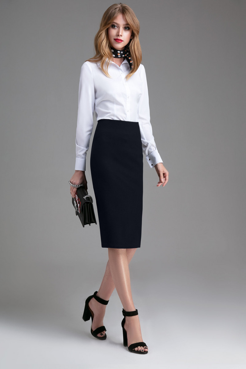 Классическая юбка из трикотажного полотна. Юбка прямая, на резинке по талии. Юбка длиной ниже коленей, зауженная к низу. Заднее полотнище юбки со средним швом, который заканчивается глубоким разрезом для удобной ходьбы. Отличный вариант для офиса.