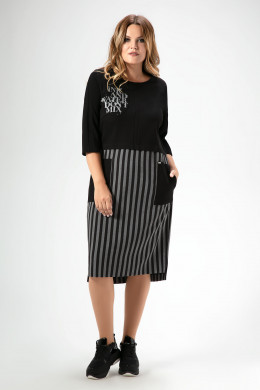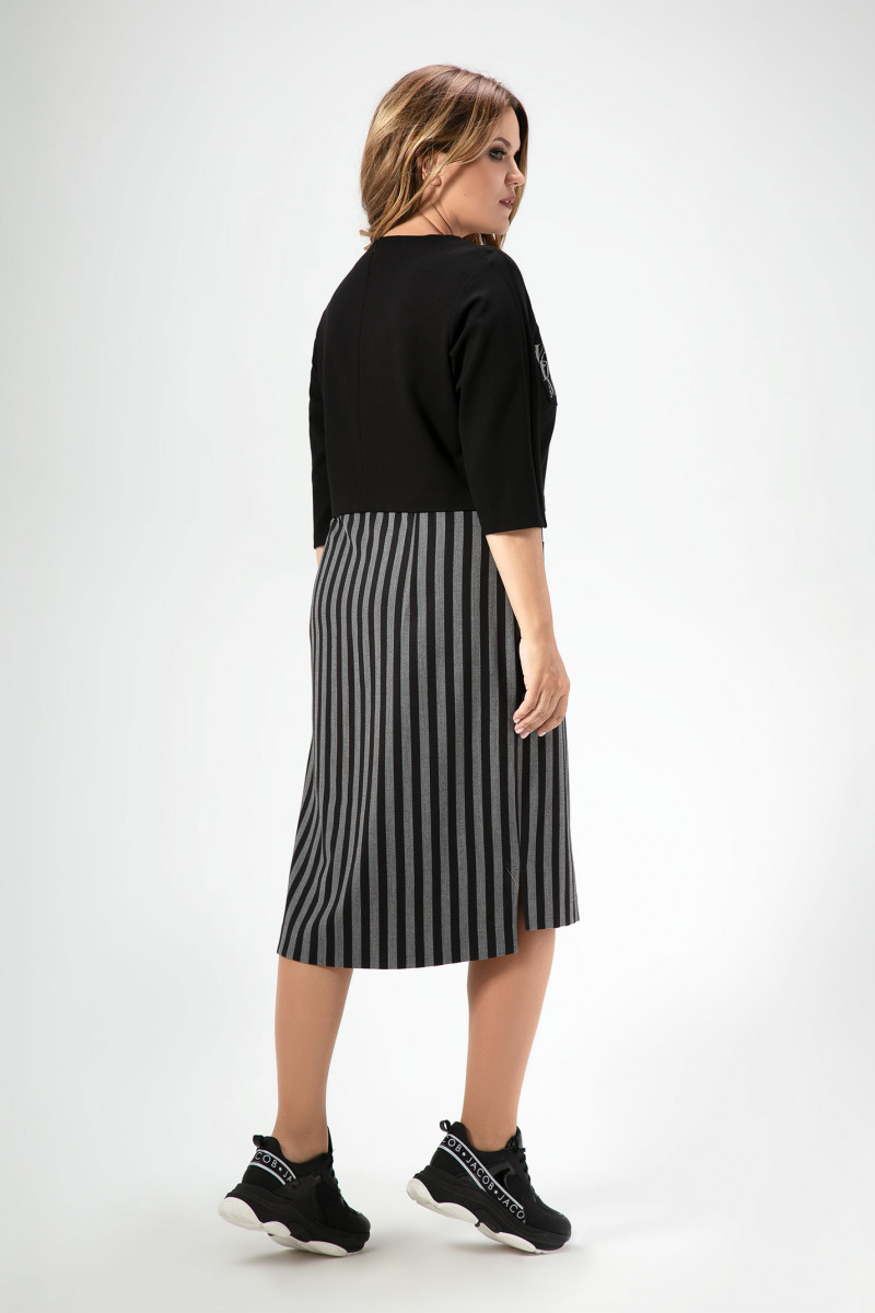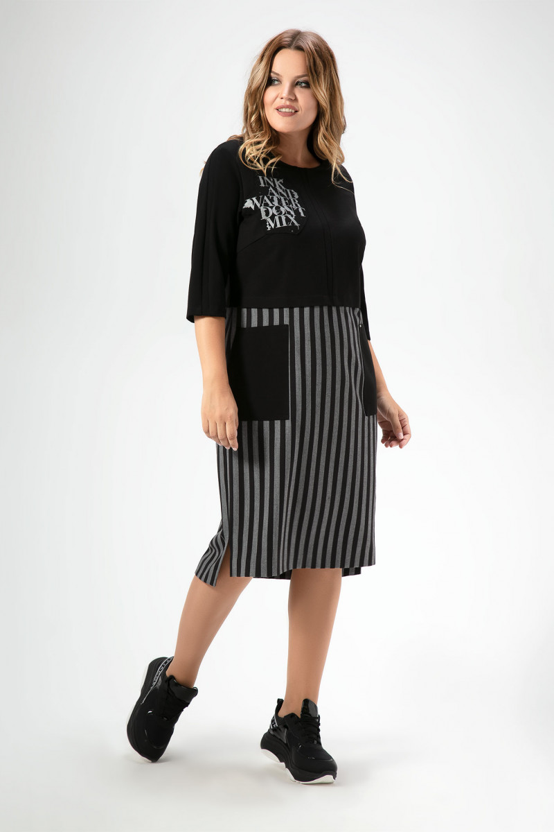 Осеннее женское платье будет прекрасным вариантом для девушки как на каждый день,так и в офис. Изделие сочетает в себе две ткани:мягкий немнущийся текстиль в полоску и трикотаж,обеспечивающий комфорт и эластичность. Силуэт платья прямой и немного приталенный.Вырез горловины круглый.Застёгивается сзади на потайную молнию в среднем шве. Рукав втачной ,длина 3/4 .Платье отрезное на уровне чуть выше талии.По переду выполнены накладные карманы с боковым входом,что очень удобно.по кукавам ,плечам и по переду выполнены врезные лампасы из основной ткани,которые визуально стройнят фигуру и придают образу спортивность.Линия низа неровная.Сзади платье длиннее.
