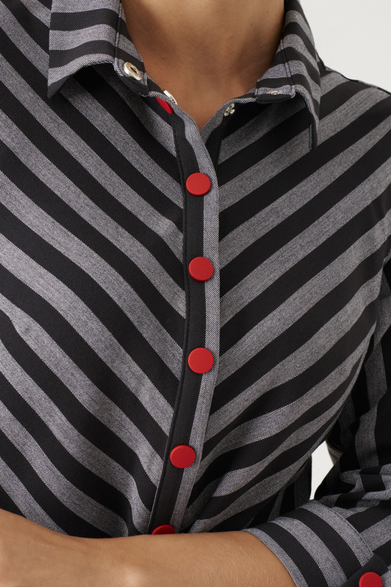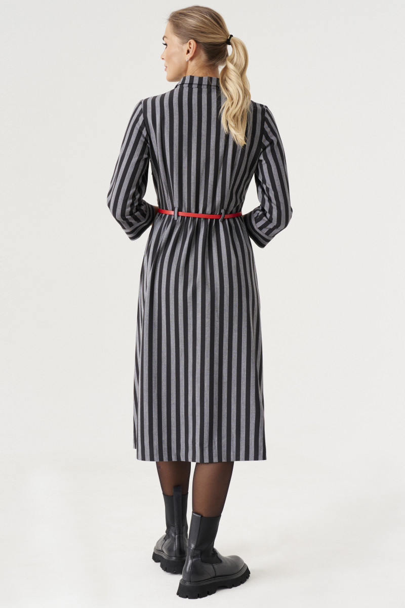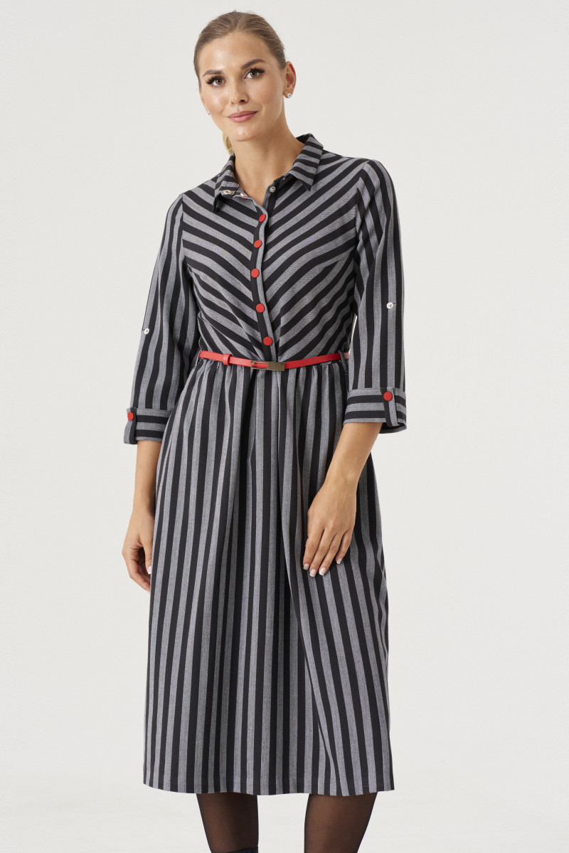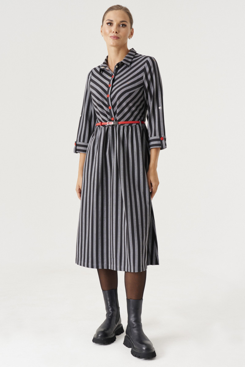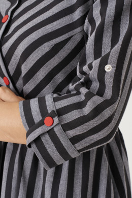 Элегантное стильное платье построеное на сочетании графичной чёрно-серой полосы и ярких красных акцентов. Платье отрезное по линии талии с расклешоной юбкой .Длина ниже колена и с внутренними карманами по бокам.Талия посажена на резинку.В боковом шве оформлена потайная молния. Лиф прилегающий с рубашечным воротником и застёжкой на планке на петли и пуговицы до талии. Рукав втачной с притачной отложной манжетой и патой,позволяющей менять длину рукава.Игра полос в платье невероятно стройнит фигуру.Платье будет прекрасным вариантом на каждый день и в офис для стильной и яркой девушки.