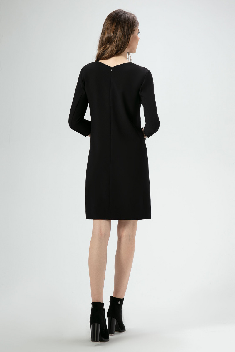 Платье короткое женское вечернее создано в длине мини, поэтому красиво открывает стройные ножки, акцентирует на округлых коленях. Платье прямое женское слегка прилегает к телу, не обтягивая его, поэтому никакие складочки и контуры нижнего белья не будут видны. Округлая горловина, длинный рукав до локтя, потайная застежка-молния на спинке - детали, придающие изделию индивидуальность.