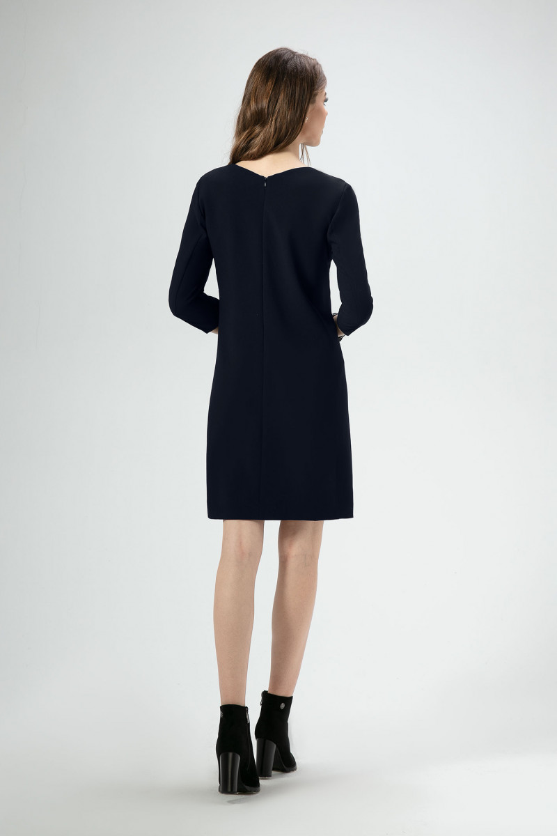 Платье короткое женское вечернее создано в длине мини, поэтому красиво открывает стройные ножки, акцентирует на округлых коленях. Платье прямое женское слегка прилегает к телу, не обтягивая его, поэтому никакие складочки и контуры нижнего белья не будут видны. Округлая горловина, длинный рукав до локтя, потайная застежка-молния на спинке - детали, придающие изделию индивидуальность.