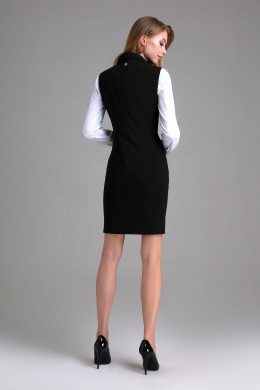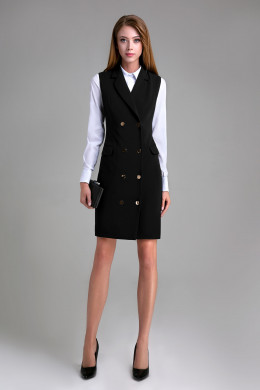 Стильное женское платье-жилет. Платье рекомендуем носить как в сочетании с различными блузками и джемперами, или в комплекте с брюками, как модный удлиненный жилет. Платье полуприлегающего силуэта, длиной до коленей. Застежка сквозная двубортная на кнопки. По переду имеются карманы с клапаном. По переду и по спинки имеются рельефные швы, которые обеспечивают отличную посадку изделия по фигуре. Отличный строгий вариант для офиса.