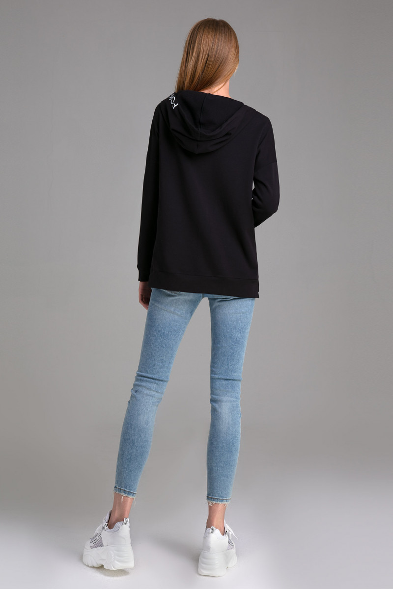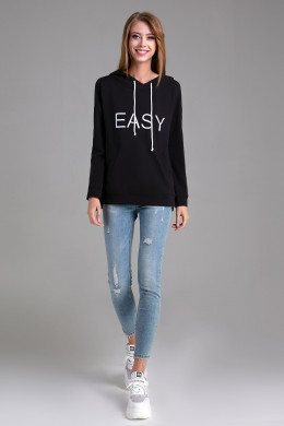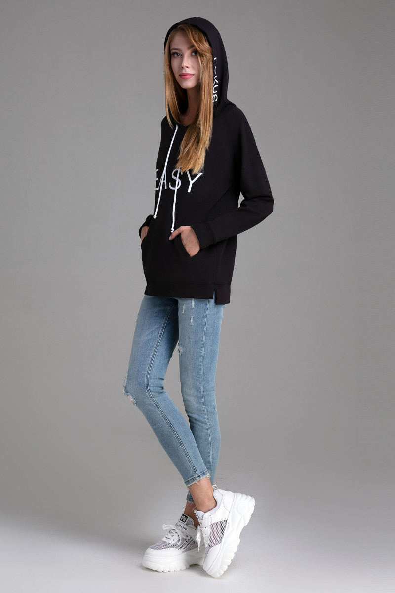 Джемпер женский максимально стильный и удобный.Идеальный вариант для прогулок,любительского спорта и досуга.У джемпера прямой силуэт,спущенная линия плеча,прямой свободный рукав,присобранный снизу на манжету,мягкой формы капюшон с небольшим запахом спереди и кулисой в виде белого шнура.По переду выполнены входы во внутренний карман -"кенгуру". По низу выполнен отрезной манжет,который спереди короче,а сзади-длиннее.По бокам манжеты не стачены между собой и образуют разрез.По переду и по капюшону выполнены шрифтовые принты.