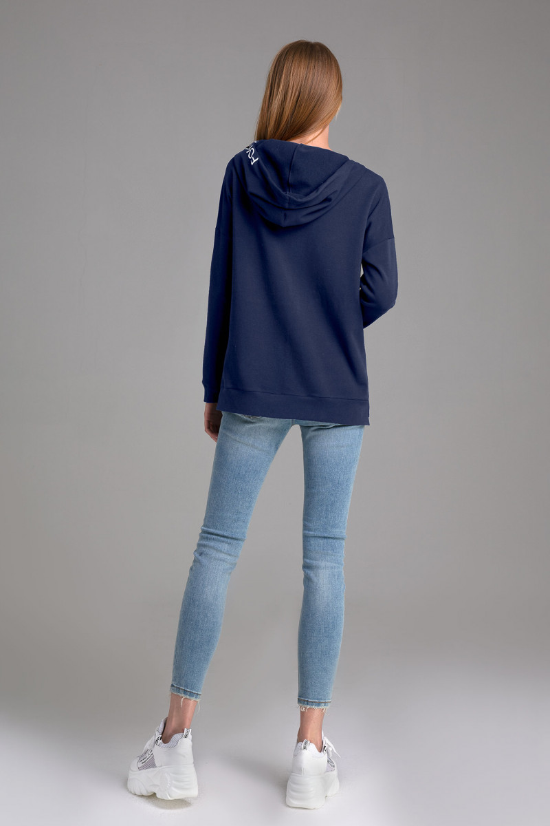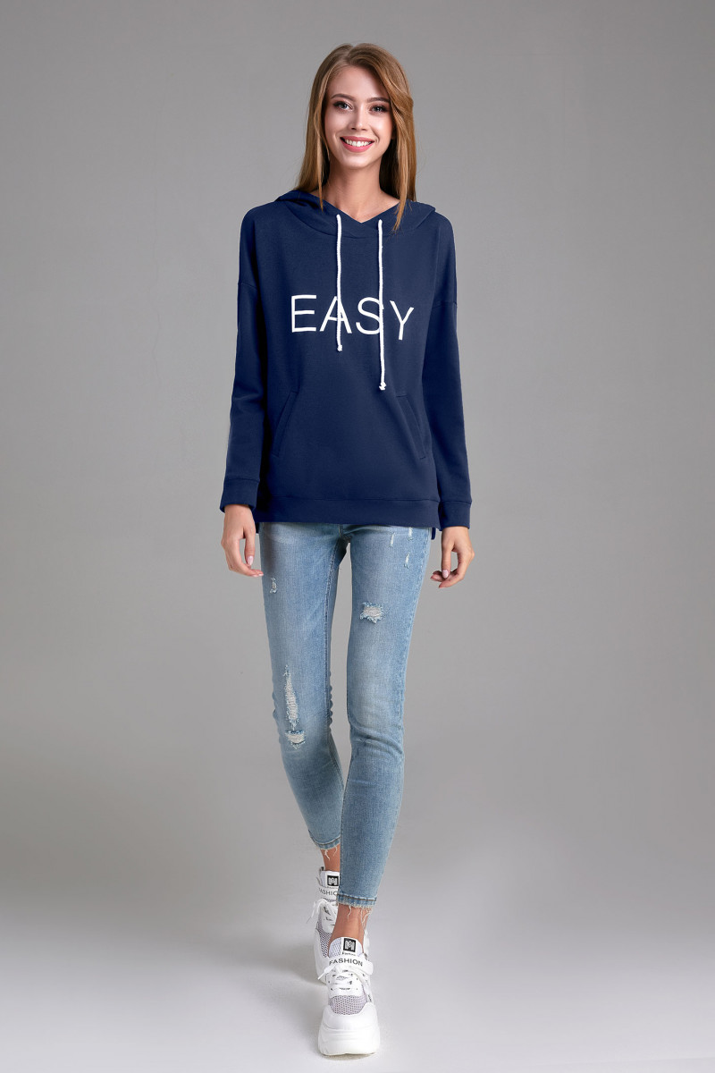 Джемпер женский максимально стильный и удобный.Идеальный вариант для прогулок,любительского спорта и досуга.У джемпера прямой силуэт,спущенная линия плеча,прямой свободный рукав,присобранный снизу на манжету,мягкой формы капюшон с небольшим запахом спереди и кулисой в виде белого шнура.По переду выполнены входы во внутренний карман -"кенгуру". По низу выполнен отрезной манжет,который спереди короче,а сзади-длиннее.По бокам манжеты не стачены между собой и образуют разрез.По переду и по капюшону выполнены шрифтовые принты.