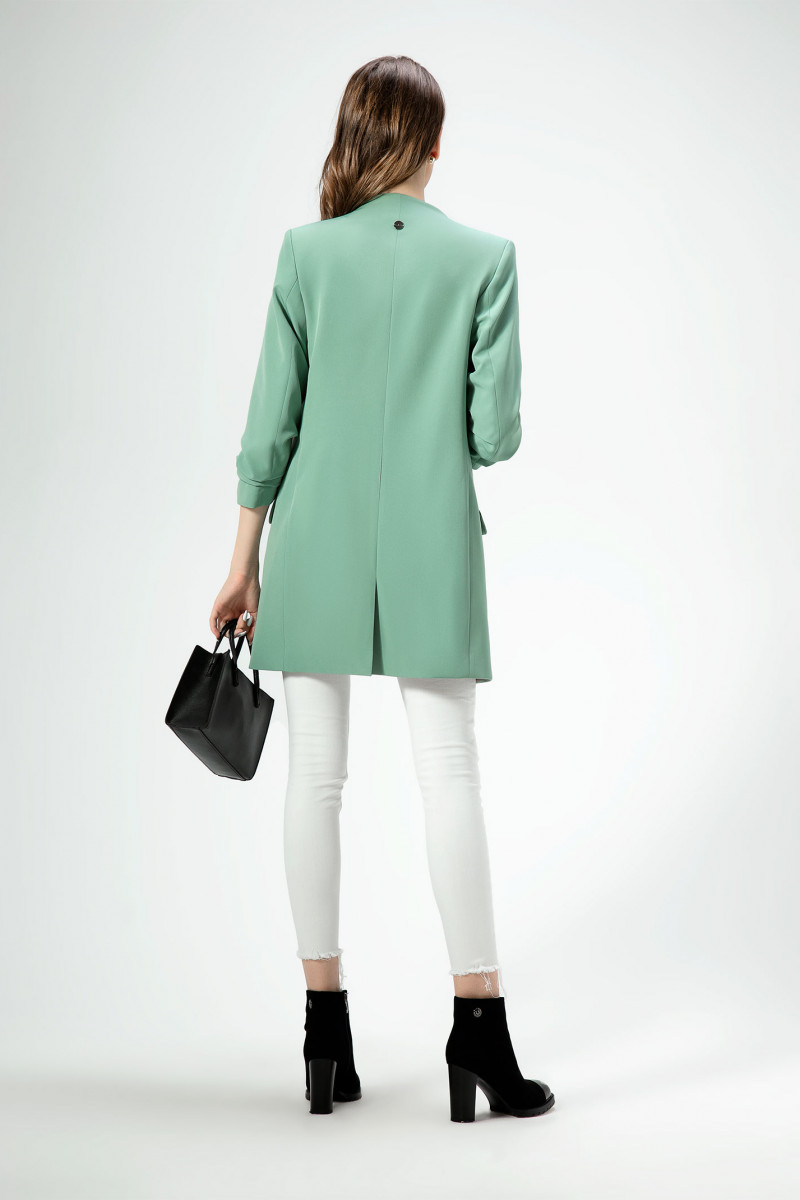 Стильный модный жакет в стиле "кэжуал". Это повседневный удобный и практичный жакет, который отлично сочетается как с джинсами, так и с брюками. Жакет удлиненный, без застежки, рукава длиной ниже локтя. По переду имеются карманы. Спинка со средним швом, который заканчивается шлицей. Жакет на подкладки.