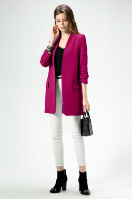 Стильный модный жакет в стиле "кэжуал". Это повседневный удобный и практичный жакет, который отлично сочетается как с джинсами, так и с брюками. Жакет удлиненный, без застежки, рукава длиной ниже локтя. По переду имеются карманы. Спинка со средним швом, который заканчивается шлицей. Жакет на подкладки.