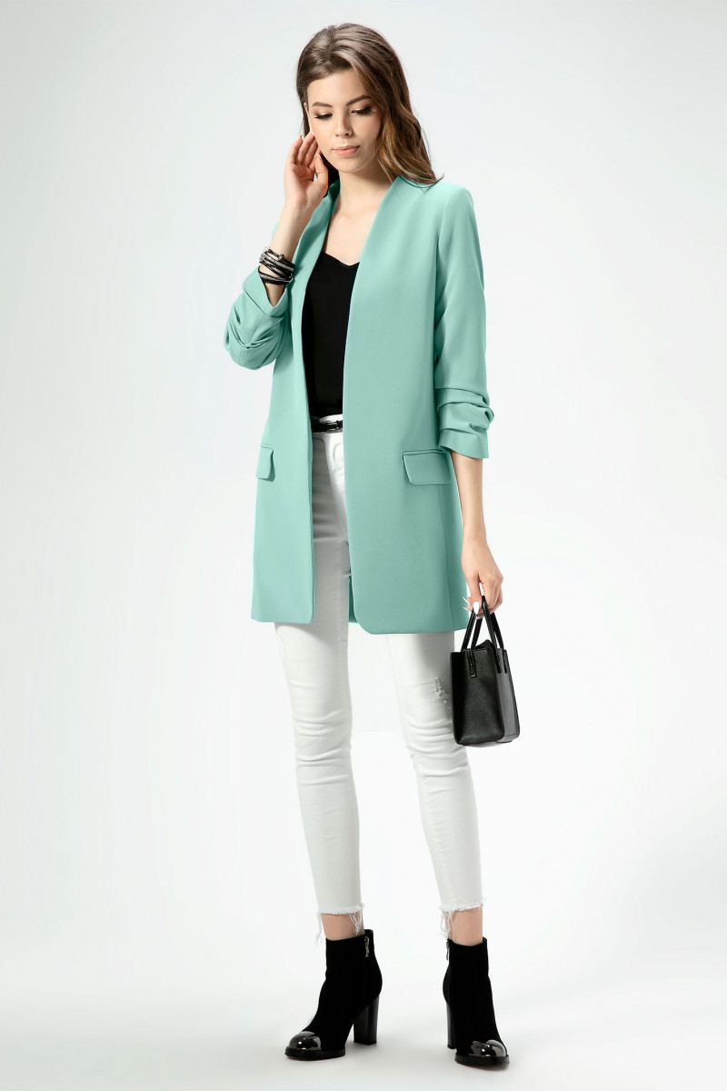 Стильный модный жакет в стиле "кэжуал". Это повседневный удобный и практичный жакет, который отлично сочетается как с джинсами, так и с брюками. Жакет удлиненный, без застежки, рукава длиной ниже локтя. По переду имеются карманы. Спинка со средним швом, который заканчивается шлицей. Жакет на подкладки.