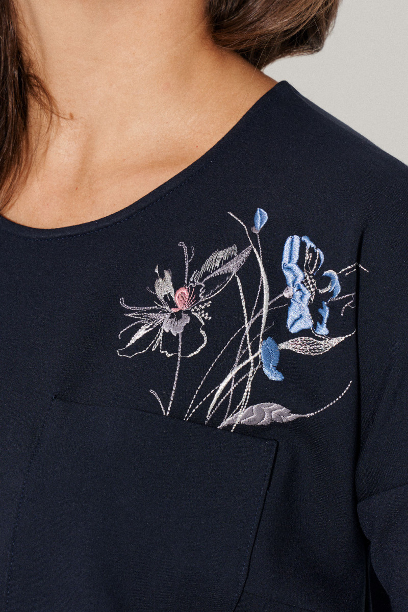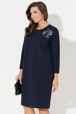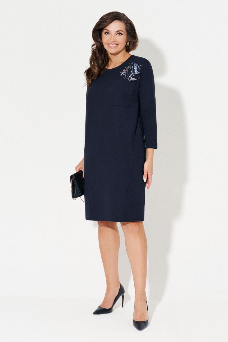 Стильное лаконичное платье из трикотажного полотна. Платье зауженное к низу, с круглым вырезом горловины по переду и фигурным вырезом горловины по спинки.По спинки имеется декоративная молния. Платье дополнено карманом по переду и изящной дизайнерской вышивкой.