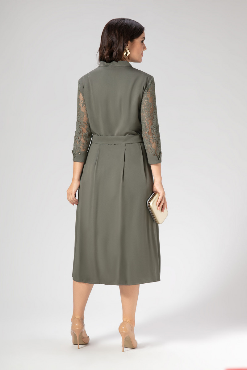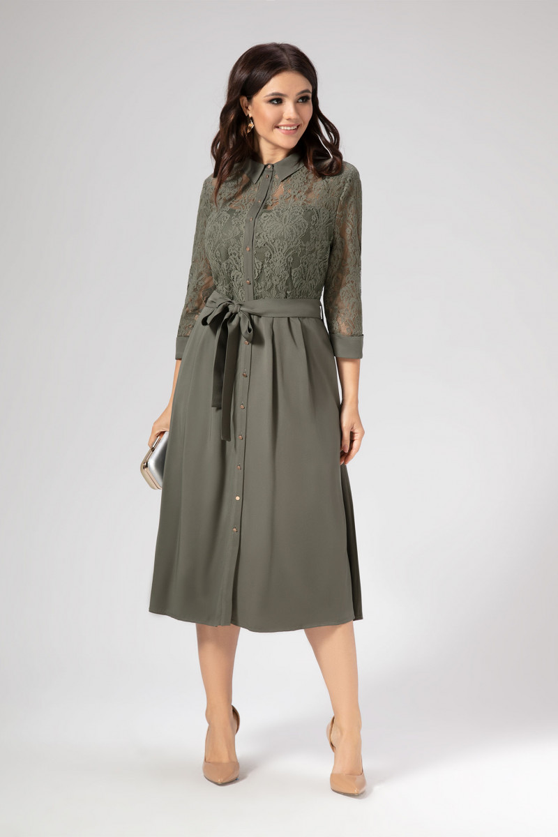 Очаровательное женственное платье с рубашечными воротником и застёжкой выполнено на сочетании кружевного и гладкого полотен.Отрезное по линии талии платье имеет прилегающего силуэта кружевной лиф и расклешоную книзу удлинённую юбку,верхний срез которой образует сверху 4 глубоких складки.В боковых швах юбки оформлены внутренние карманы.Длина рукава 3/4.По низу выполнен отрезной манжет из основной ткани ,который откладывается наверх и имеет разрез. На талии завязывается съёмный пояс из основной ткани.Платье невероятно стройнит,придаёт чувство уверенности в себе и дарит ощущение комфорта и лёгкости. Платье можно назвать нарядно-повседневным и безусловно великолепным для любого случая.