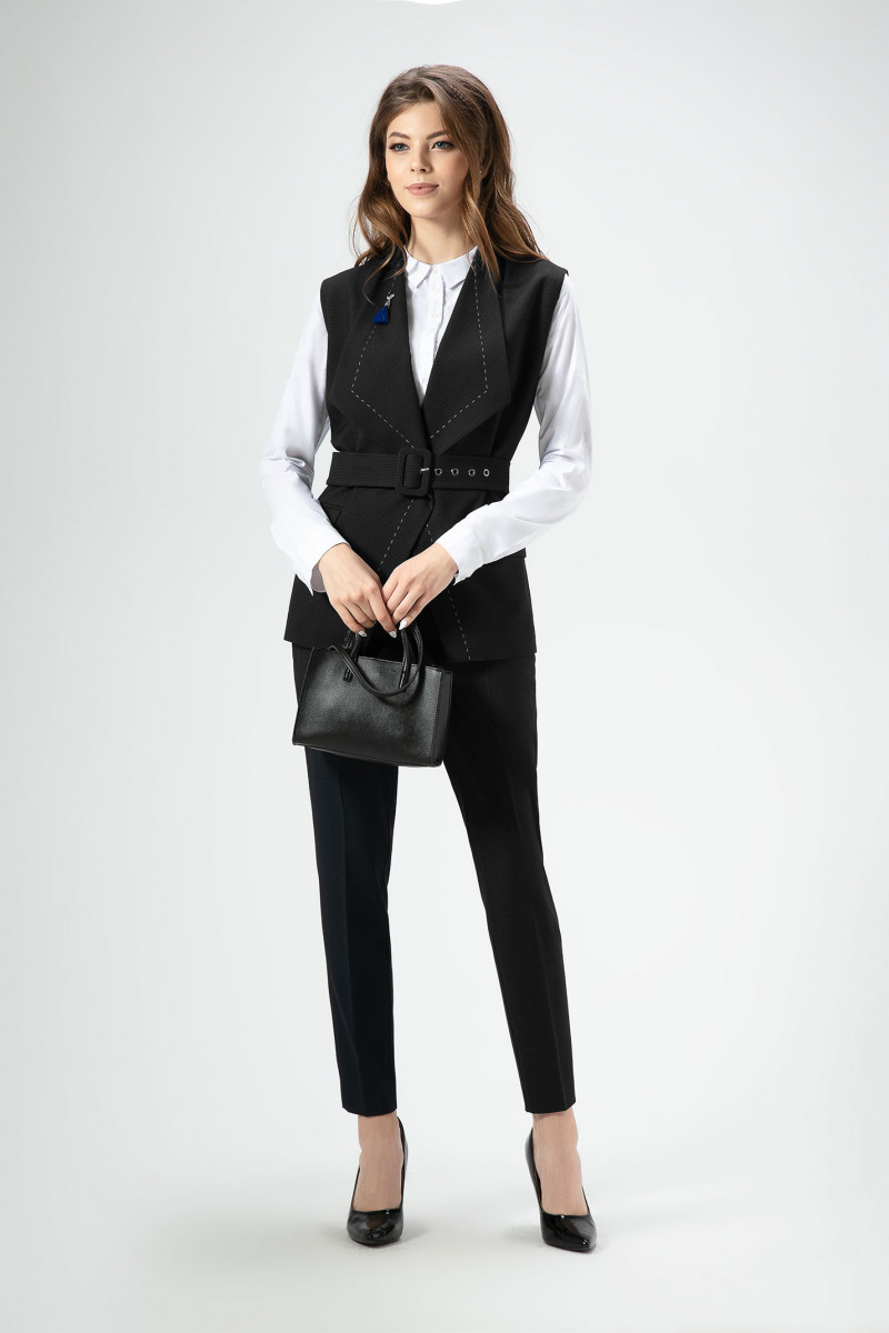 Стильный жилет из поливискозной ткани, полуприлегающего силуэта, с большими лацканами и декоративным ручным стежком по лацкану, с рельефными и нагрудными вытачками, на боковых деталях карманы с клапанами. Спинка со средним швом и рельефными швами. В комплект входит пояс из основной ткани и декоративная брошь. Отличный вариант для офиса и деловых встреч.