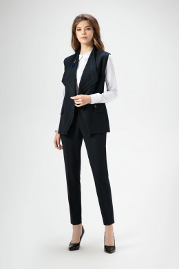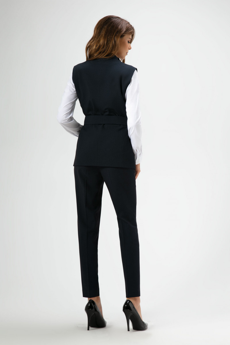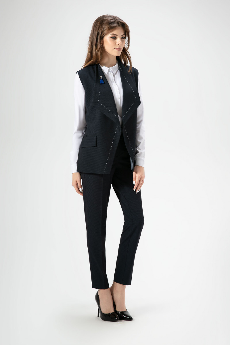 Стильный жилет из поливискозной ткани, полуприлегающего силуэта, с большими лацканами и декоративным ручным стежком по лацкану, с рельефными и нагрудными вытачками, на боковых деталях карманы с клапанами. Спинка со средним швом и рельефными швами. В комплект входит пояс из основной ткани и декоративная брошь. Отличный вариант для офиса и деловых встреч.