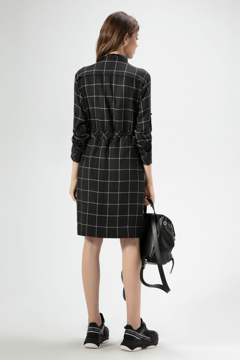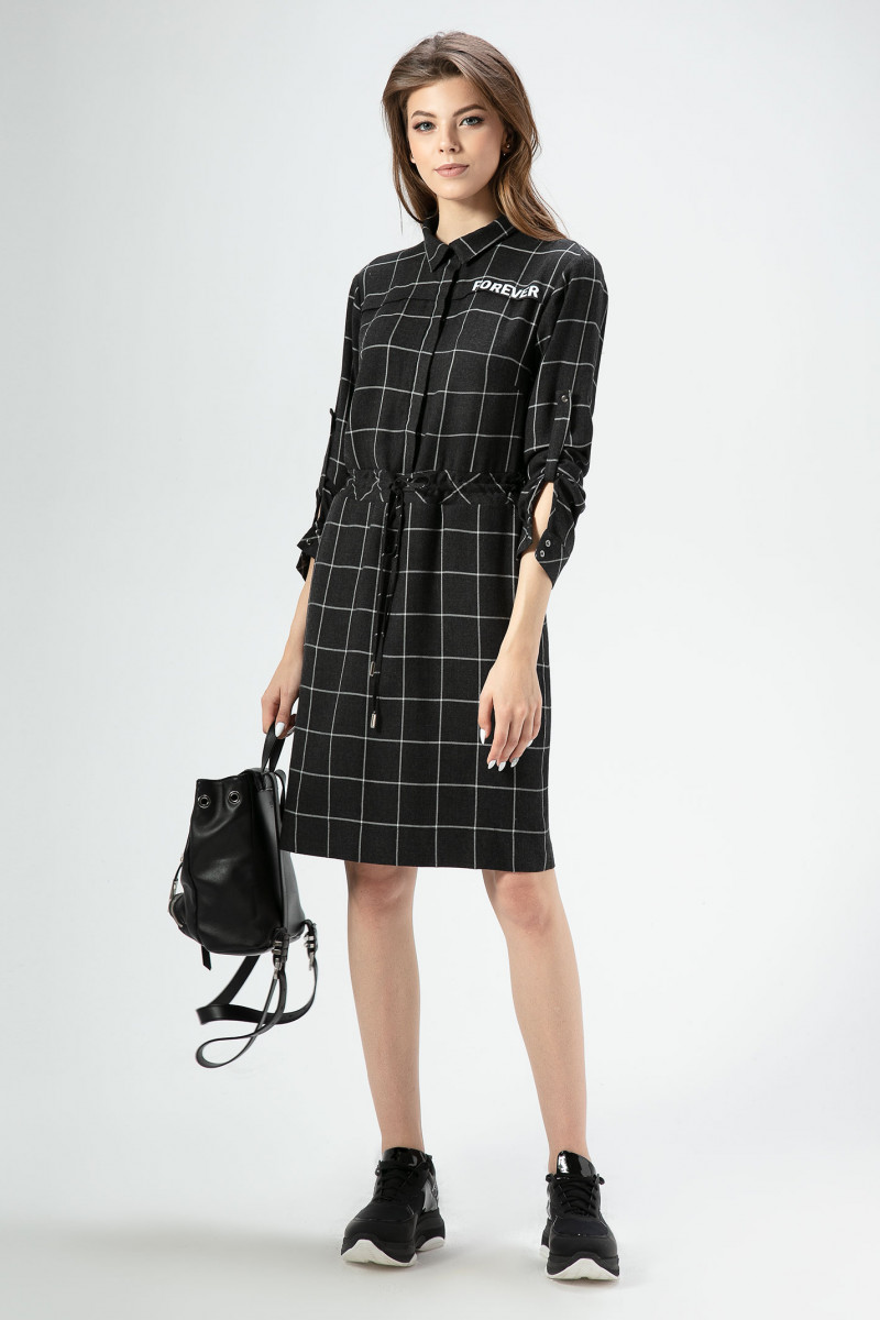 Молодежное платье из вискозной ткани с рисунком в клетку. Платье прямого силуэта, отрезное по талии с декоративным шнурком. Платье с длинными рукавами, на рукавах имеются паты, которые регулируют длину рукава, низ рукавов с притачными манжетами на кнопках. Платье с застежкой по переду на потайные петли и пуговицы. По переду расположены карманы, идущие к боковым швам. По спинки и по переду имеется кокетка, по переду на кокетки нанесена декоративная надпись. Платье в спортивном стиле отличный удобный вариант на каждый день.