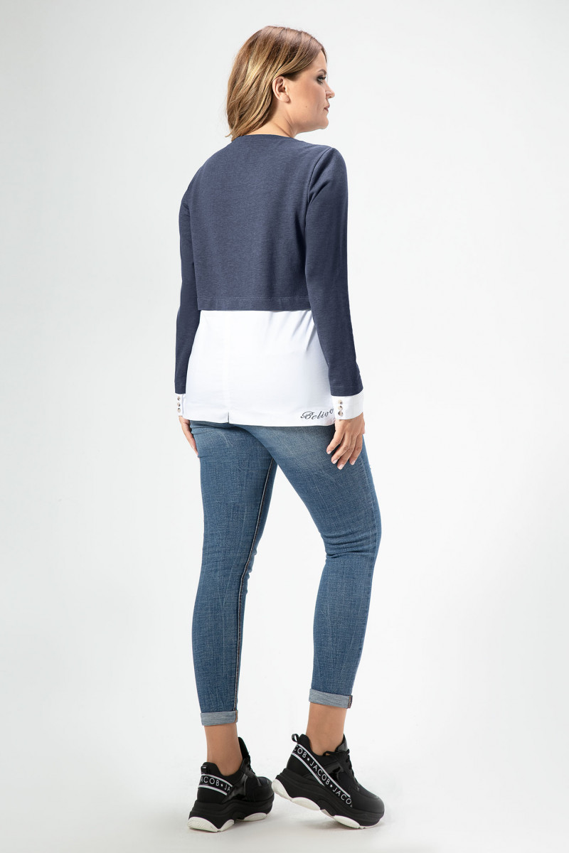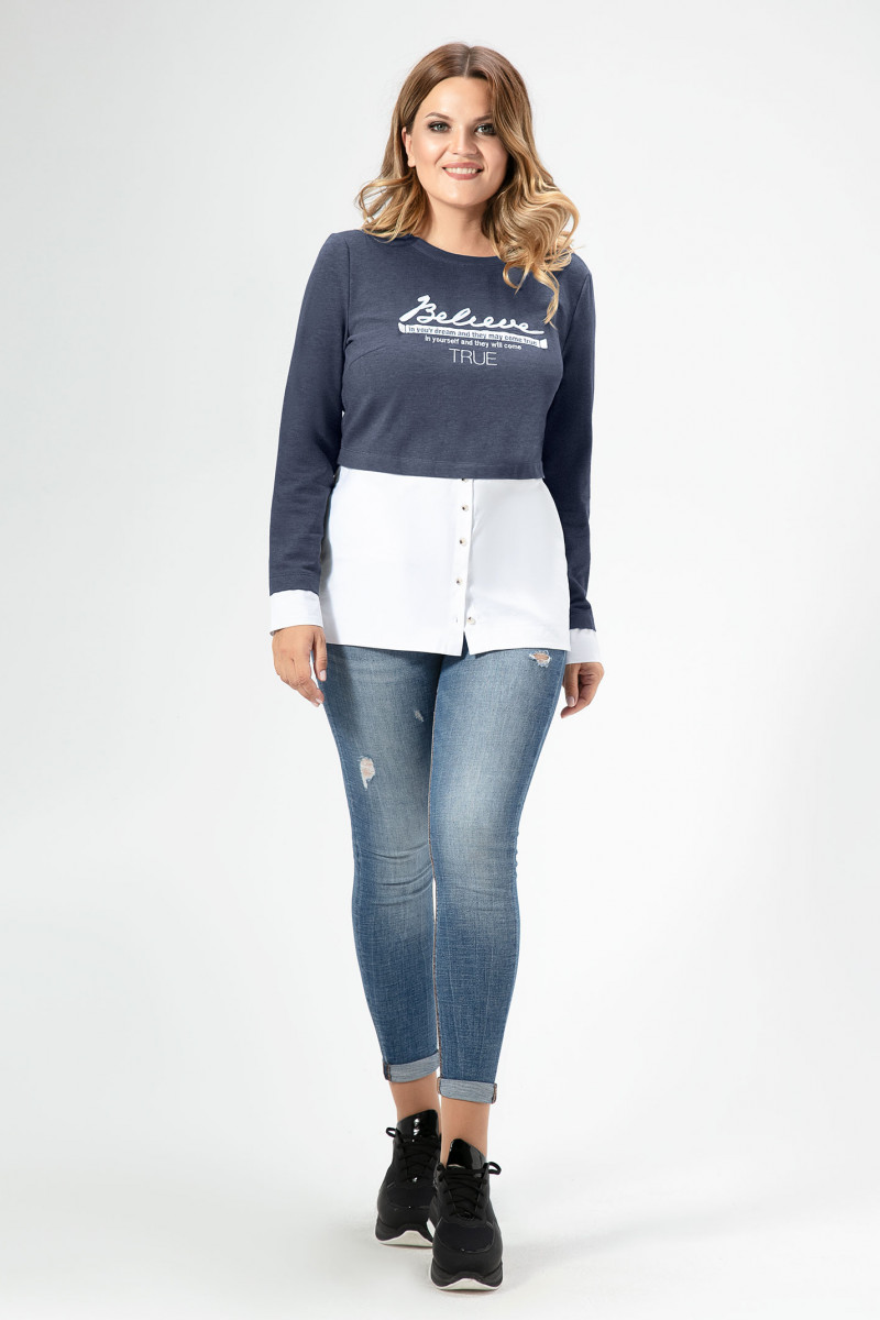 Стильный молодежный джемпер идеально подойдет тем, кто любит одеваться в стиле «кэжуал». Джемпер идеально сочетается с джинсами и подходит для повседневной носки. Джемпер создан на сочетании трикотажного хлопкового полотна и хлопковой сорочечной ткани, имитирующей двухслойность в одежде. Джемпер полуприлегающего силуэта с круглым вырезом горловины с длинными рукавами. Низ рукавов с приточными декоративными манжетами. В боковых швах джемпера имеются глубокие карманы. Джемпер дополнен оригинальной дизайнерской вышивкой по переду и внизу изделия по спинке.