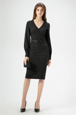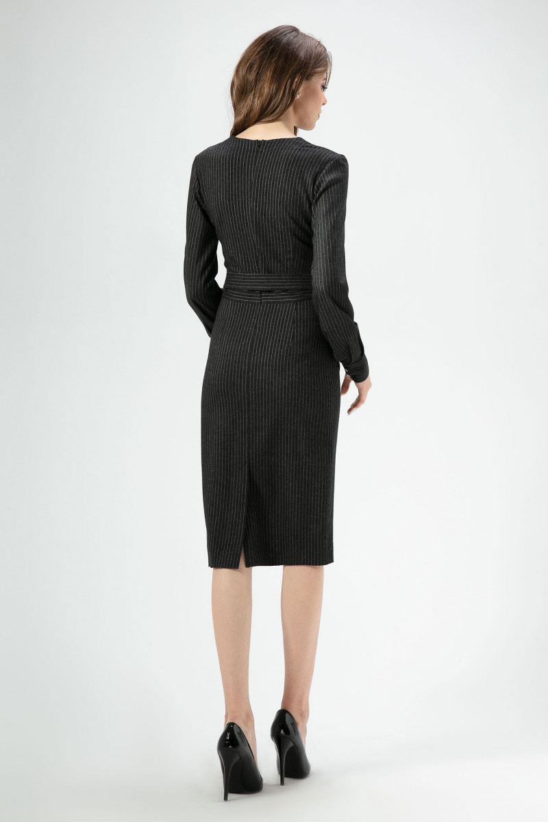 Изящное платья для офиса с красивым декольте и разрезом по переду. Платье из вискозной ткани с рисунком в полоску. Платье облегающего силуэта, отрезное по талии с декоративным съёмным поясом из основной ткани. Рукава длинные на широкой притачной манжете. На манжете имеются декоративные металлические кнопки.Вырез платья V-образной формы. По переду и по спинки имеются вытачки, которые обеспечивают посадку изделия по фигуре. Застежка на потайную молнию по спинки. Средний шов спинки заканчивается шлицей. По переду имитация запаха, разрез на левой детали переда. Отличный вариант изящного платья для офиса.
