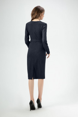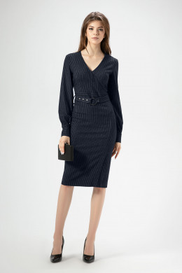 Изящное платья для офиса с красивым декольте и разрезом по переду. Платье из вискозной ткани с рисунком в полоску. Платье облегающего силуэта, отрезное по талии с декоративным съёмным поясом из основной ткани. Рукава длинные на широкой притачной манжете. На манжете имеются декоративные металлические кнопки.Вырез платья V-образной формы. По переду и по спинки имеются вытачки, которые обеспечивают посадку изделия по фигуре. Застежка на потайную молнию по спинки. Средний шов спинки заканчивается шлицей. По переду имитация запаха, разрез на левой детали переда. Отличный вариант изящного платья для офиса.