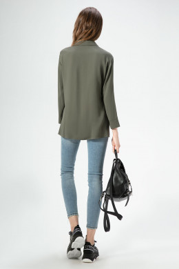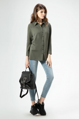 Стильная повседневная блузка из вискозы очень приятна на ощупь и выглядит просто и стильно одновременно. Рубашечный воротник на стойке.Рукав втачной,длина 3/4 .По низу рукава выполнена притачная манжета с декоративной отстрочкой.По переду выполнена отрезная кокетка.В срезе кокетки оформлены внутренние карманы,мешковины которых настрочены отделочными строчками на деталь переда изнутри.Изюминкой рубашки является декоративная тесьма,которая настрачивается на нижнюю планку застёжки. Функциональные чёрные пуговицы на ножке также несут и декоративную функцию.Блузка прямого силуэта ,визуально стройнит фигуру и выглядит очень эффектно.