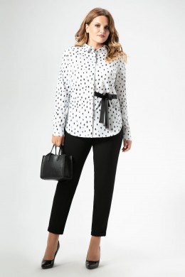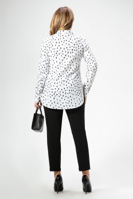 Очень стильная повседневная блузка прямого силуэта ,которая позволит девушке выглядеть нарядно и представительно каждый день. Чёрно-белая графика в принте ткани и в деталях выглядит очень эффектно и сразу привлекает внимание.Воротник рубашечный на стойке.Застёжка потайная спереди на цельнокроеную планку с петлями и пуговицами.Спинка удлминена относительно переда.Низ фигурной округлой формы,по бокам разрезы.Рукав втачной снизу прихвачен на высокий манжет. На левой части переда на уровне талии оформлена завязка на бант из репсовой ленты. Завязка немного стягивает под собой деталь переда и придаёт силуэту стройность,а образу утончённость и стиль.Блузка рекомендуется деловым и предприимчивым леди с безупречным вкусом и чувством стиля.