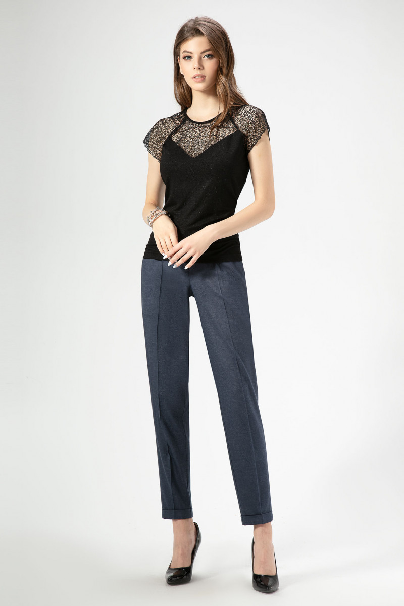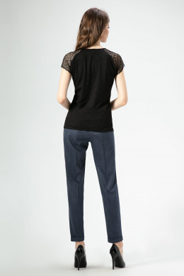 Изящный джемпер из трикотажного полотна в сочетании с кружевом. Джемпер полуприлегающего силуэта с круглым вырезом горловины с коротким рукавом кроя «реглан». По переду имеется декоративный подрез. Такой джемпер отлично подойдет в офис в сочетании с различными жакетами, юбками и брюками.