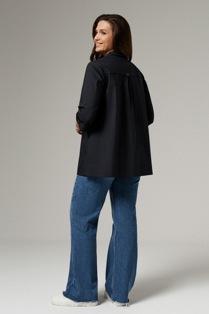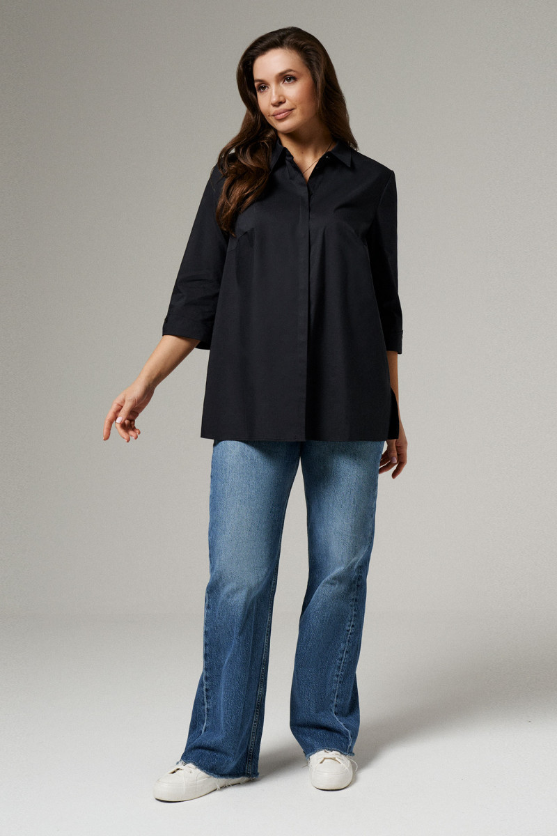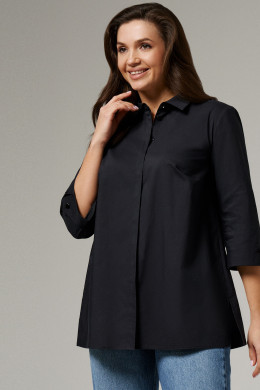 Лаконичная и строгая блузка из хлопковой ткани – отличный вариант для офиса. Блузка полуприлегающего силуэта слегка расширенная к низу, по бокам имеются небольшие разрезы. Блузка с центральной сквозной застежкой на потайные петли и пуговицы и одну декоративную пуговицу на стойке воротника. По переду имеются нагрудные выточки, по спинке имеется кокетка, от кокетки - небольшая сборка, что обеспечивает особый комфорт. Рукава длиной чуть ниже локтя, с отложными манжетами. На манжетах имеются декоративные петли и пуговицы. Такая блузка отлично сочетается с различными брюками, джинсами, сарафанами, создавая стильный современный образ.
