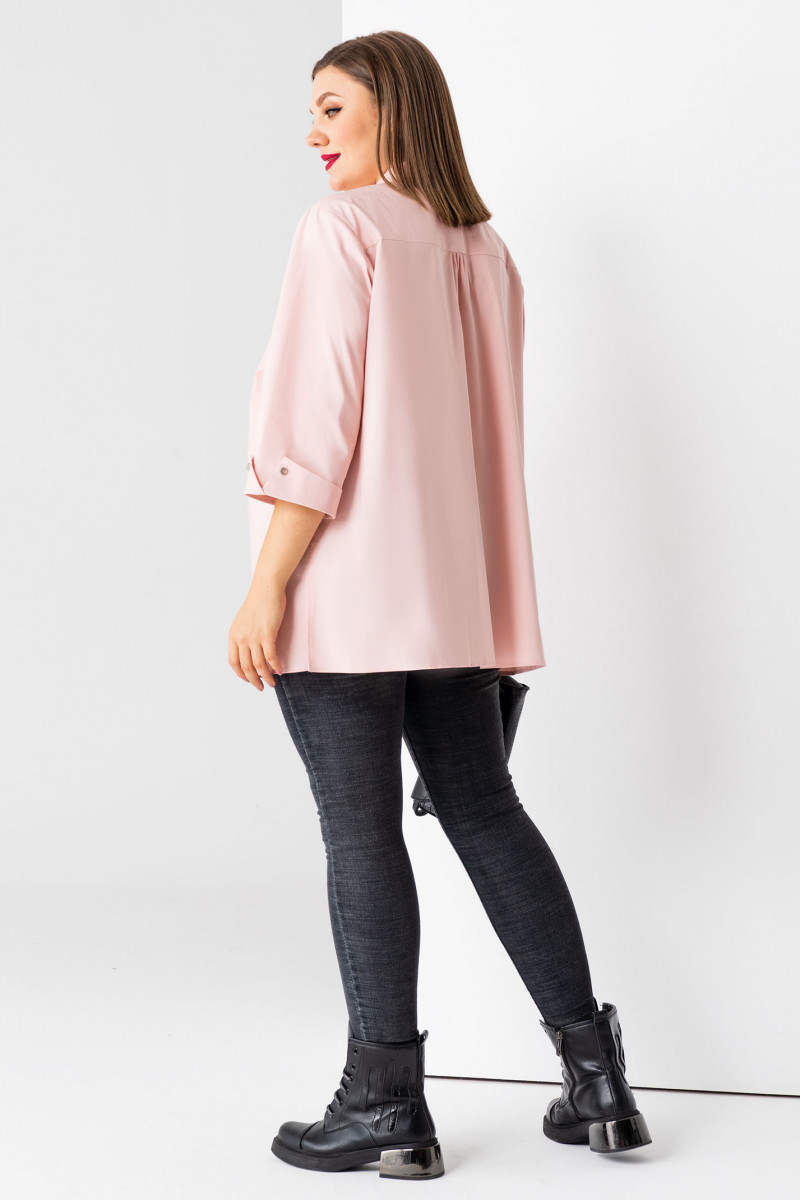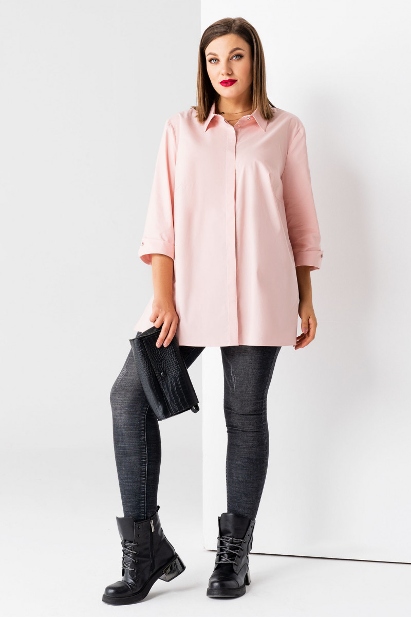 Лаконичная и строгая блузка из хлопковой ткани – отличный вариант для офиса. Блузка полуприлегающего силуэта слегка расширенная к низу, по бокам имеются небольшие разрезы. Блузка с центральной сквозной застежкой на потайные петли и пуговицы и одну декоративную пуговицу на стойке воротника. По переду имеются нагрудные выточки, по спинке имеется кокетка, от кокетки - небольшая сборка, что обеспечивает особый комфорт. Рукава длиной чуть ниже локтя, с отложными манжетами. На манжетах имеются декоративные петли и пуговицы. Такая блузка отлично сочетается с различными брюками, джинсами, сарафанами, создавая стильный современный образ.