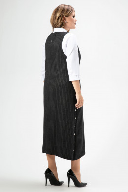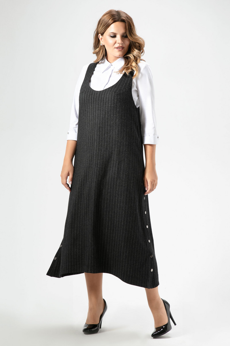 Классический сарафан из поливискозной ткани с рисунком в полоску. Сарафан без подкладки. Сарафан полуприлегающего силуэта расширенного к низу. По переду имеются нагрудные выточки, по спинке средний шов, что обеспечивает отличную посадку изделия по фигуре. Сарафан дополнен декоративными планками по бокам. На планках по низу имеются металлические кнопки, которые расстегиваются и создают разрезы. Такой сарафан будет отлично смотреться в сочетании с классической белой блузкой, создавая строгий офисный образ.