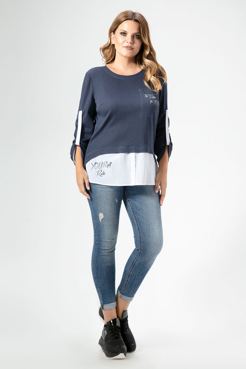 Стильная молодежная блузка из хлопкового трикотажного полотна. Блузка полуприлегающего силуэта, с длинными рукавами, с нагрудными вытачками по переду, с нагрудным карманом на левой части, с имитацией двухслойности. Блузка дополнена шрифтовым рисунком по карману и по низу изделия. Отлично сочетается как с любимыми джинсами, так и с классическими брюками.