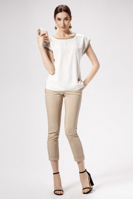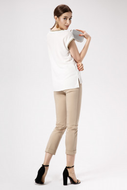 Стильная блузка и шифоновой ткани с круглым вырезом горловины. Блузка полуприлегающего силуэта, с круглым вырезом горловины. Блузка дополнена изящными довязами по горловине и по манжетам рукавов. Отличный базовый вариант блузки, который отлично сочетается с различными брюками и юбками.