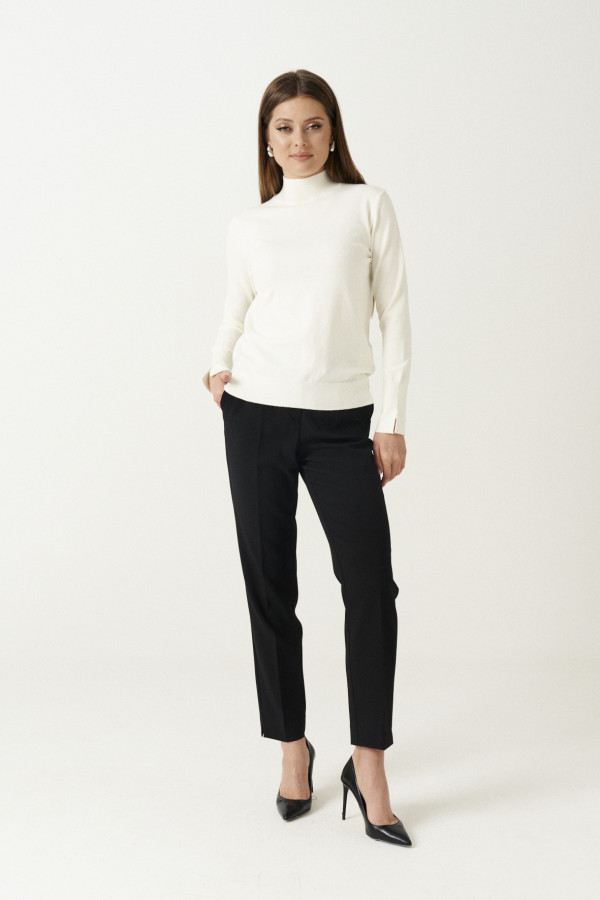 Модные брюки в полоску зауженные книзу с манжетами. По переду по бокам имеются карманы. На задних частях брюк имитация карманов в рамку. Застежка на тесьму-молнию и потайные крючоки на поясе. По поясу сзади резинка. По переду имеются декоративные шнурки по поясу, от пояса небольшие складочки.