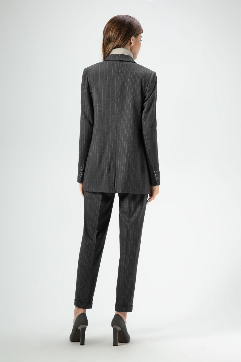 Стильные молодежные брюки из вискозной ткани с рисунком в полоску. Брюки с застежкой на молнию и крючки по переду. Пояс на резинке с декоративным шнурком. По переду имеются небольшие складочки, идущие от пояса. Брюки чуть заужены к низу, по низу манжеты. По переду брюк карманы. На задней части брюк карманы в рамку. Отличный вариант как для офиса, так и для повседневных дней.