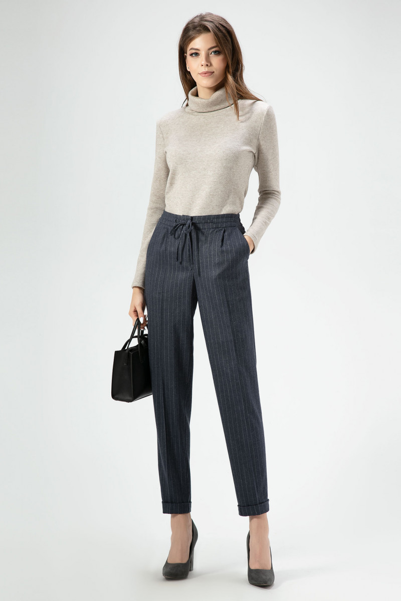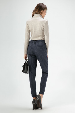 Стильные молодежные брюки из вискозной ткани с рисунком в полоску. Брюки с застежкой на молнию и крючки по переду. Пояс на резинке с декоративным шнурком. По переду имеются небольшие складочки, идущие от пояса. Брюки чуть заужены к низу, по низу манжеты. По переду брюк карманы. На задней части брюк карманы в рамку. Отличный вариант как для офиса, так и для повседневных дней.
